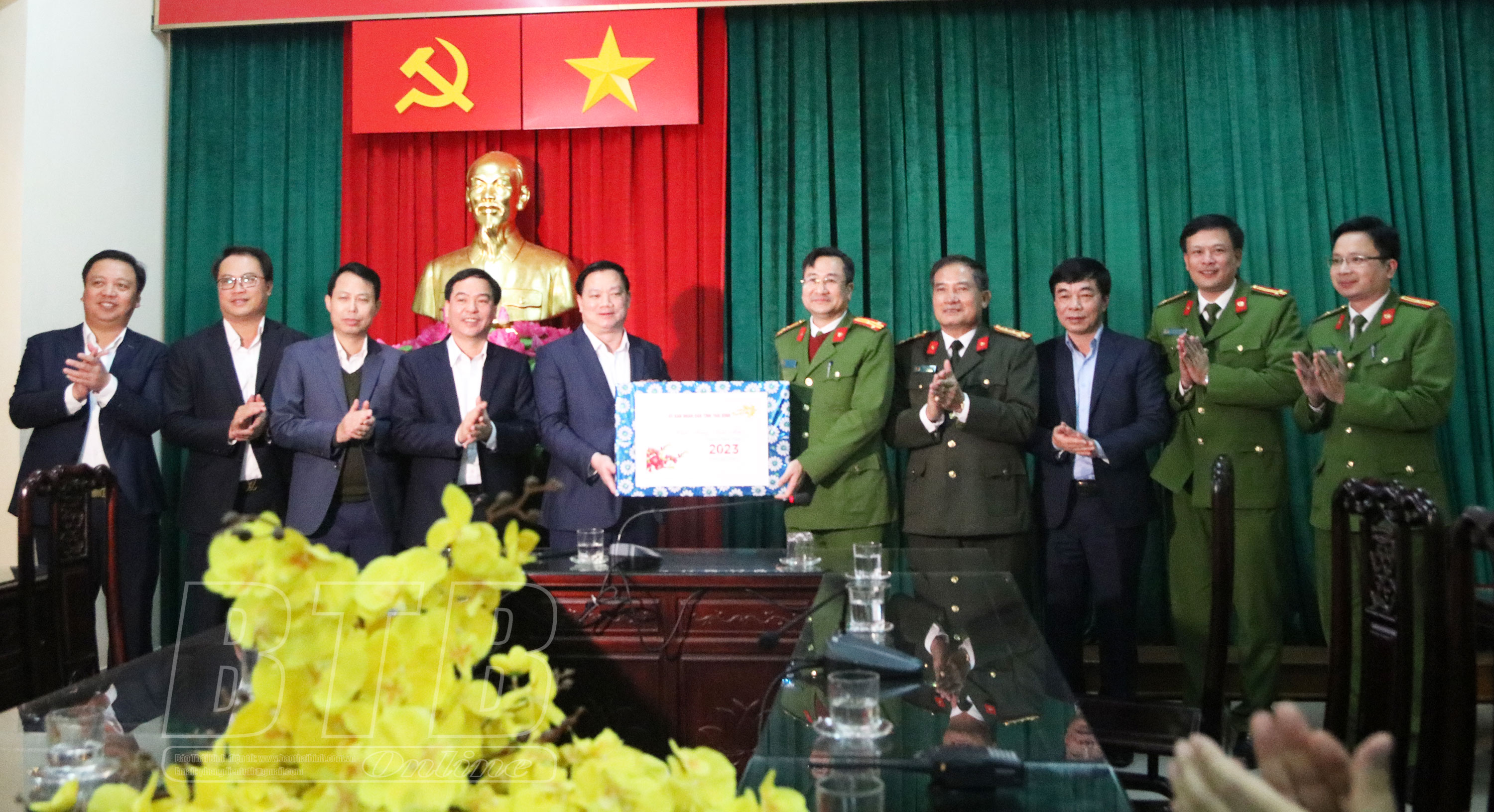 Đoàn đã đến thăm, chúc tết Thành ủy, HĐND, UBND thành phố Thái Bình; kiểm tra công tác chuẩn bị các điều kiện tổ chức bắn pháo hoa tại Trụ sở Tỉnh ủy cũ; đồng thời nghe lãnh đạo huyện Tiền Hải và lực lượng Công an huyện Tiền Hải báo cáo tình hình thực hiện các nhiệm vụ trước, trong và sau tết Nguyên đán Quý Mão 2023.