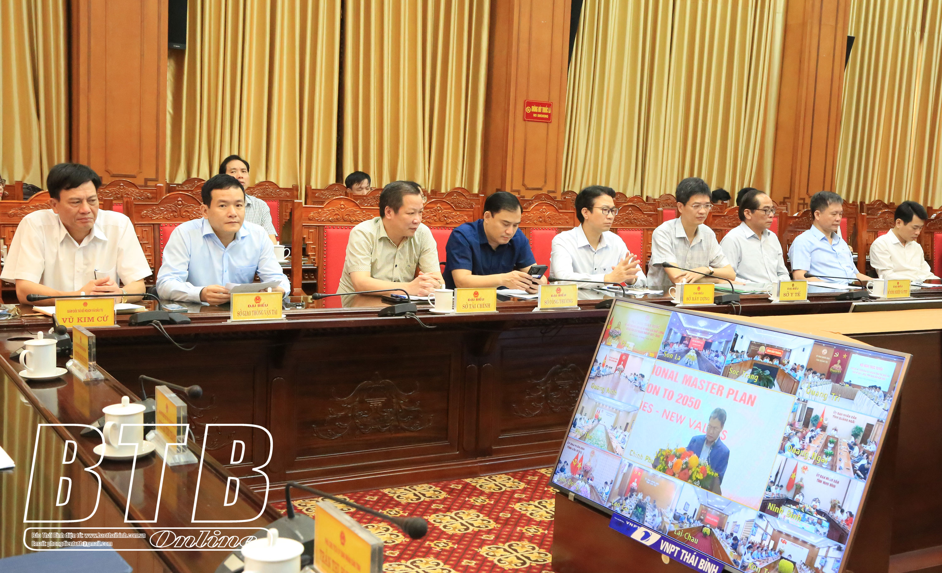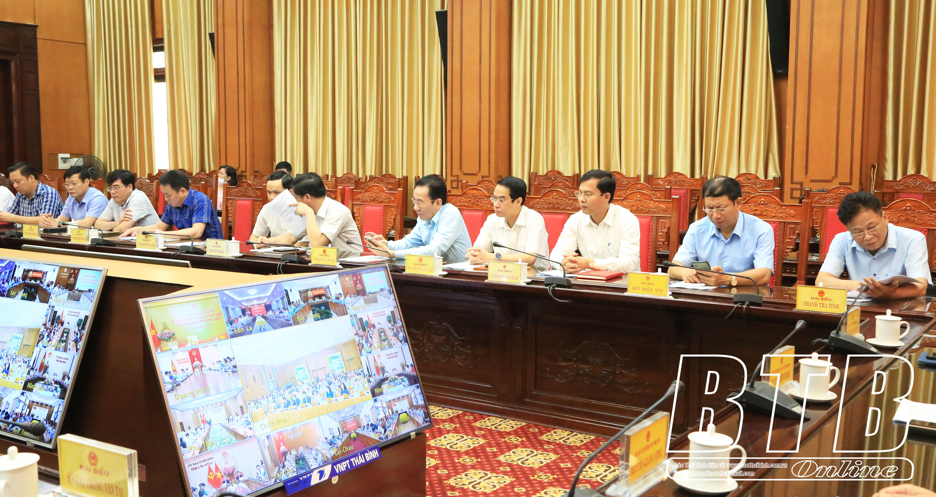 Các đồng chí lãnh đạo tỉnh dự hội nghị trực tuyến tại điểm cầu Thái Bình.