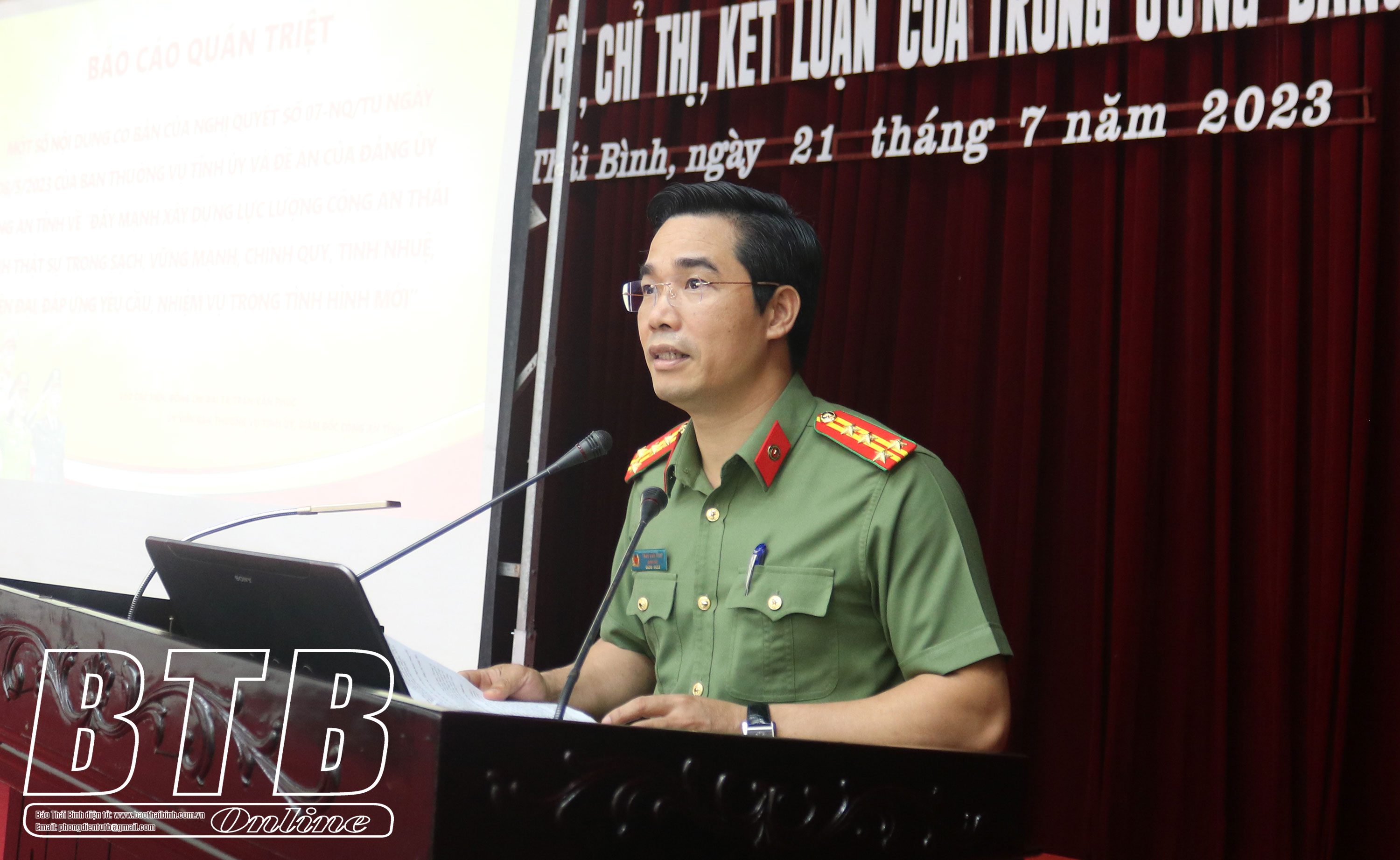 Tại hội nghị, các đại biểu đã nghe quán triệt 5 chuyên đề: Kết luận số 48-KL/TW ngày 30/1/2023 về tiếp tục thực hiện sắp xếp đơn vị hành chính cấp huyện, cấp xã giai đoạn 2023 - 2030; Kết luận số 50-KL/TW ngày 28/2/2023 của Bộ Chính trị về tiếp tục thực hiện Nghị quyết số 18-NQ/TW ngày 25/10/2017 của Ban Chấp hành Trung ương Đảng (khóa XII) “Một số vấn đề về tiếp tục đổi mới, sắp xếp tổ chức bộ máy của hệ thống chính trị tinh gọn, hoạt động hiệu lực, hiệu quả”; Thông báo Kết luận số 665-TB/TU ngày 12/6/2023 của Ban Thường vụ Tỉnh ủy về việc tiếp tục đẩy mạnh công tác luân chuyển, điều động cán bộ lãnh đạo, quản lý các cấp giai đoạn 2023 - 2025; Nghị quyết số 06-NQ/TU ngày 10/4/2023 của Ban Chấp hành Đảng bộ tỉnh về xây dựng đội ngũ công nhân lao động tỉnh Thái Bình đáp ứng yêu cầu phát triển trong tình hình mới giai đoạn 2023 - 2030, tầm nhìn đến năm 2045; Nghị quyết số 07-NQ/TU, ngày 08/5/2023 và Thông báo Kết luận số 644-TB/TU ngày 9/6/2023 của Ban Thường vụ Tỉnh ủy và Đề án của Đảng ủy Công an tỉnh về đẩy mạnh xây dựng lực lượng Công an Thái Bình thật sự trong sạch, vững mạnh, chính quy, tinh nhuệ, hiện đại, đáp ứng yêu cầu, nhiệm vụ trong tình hình mới.