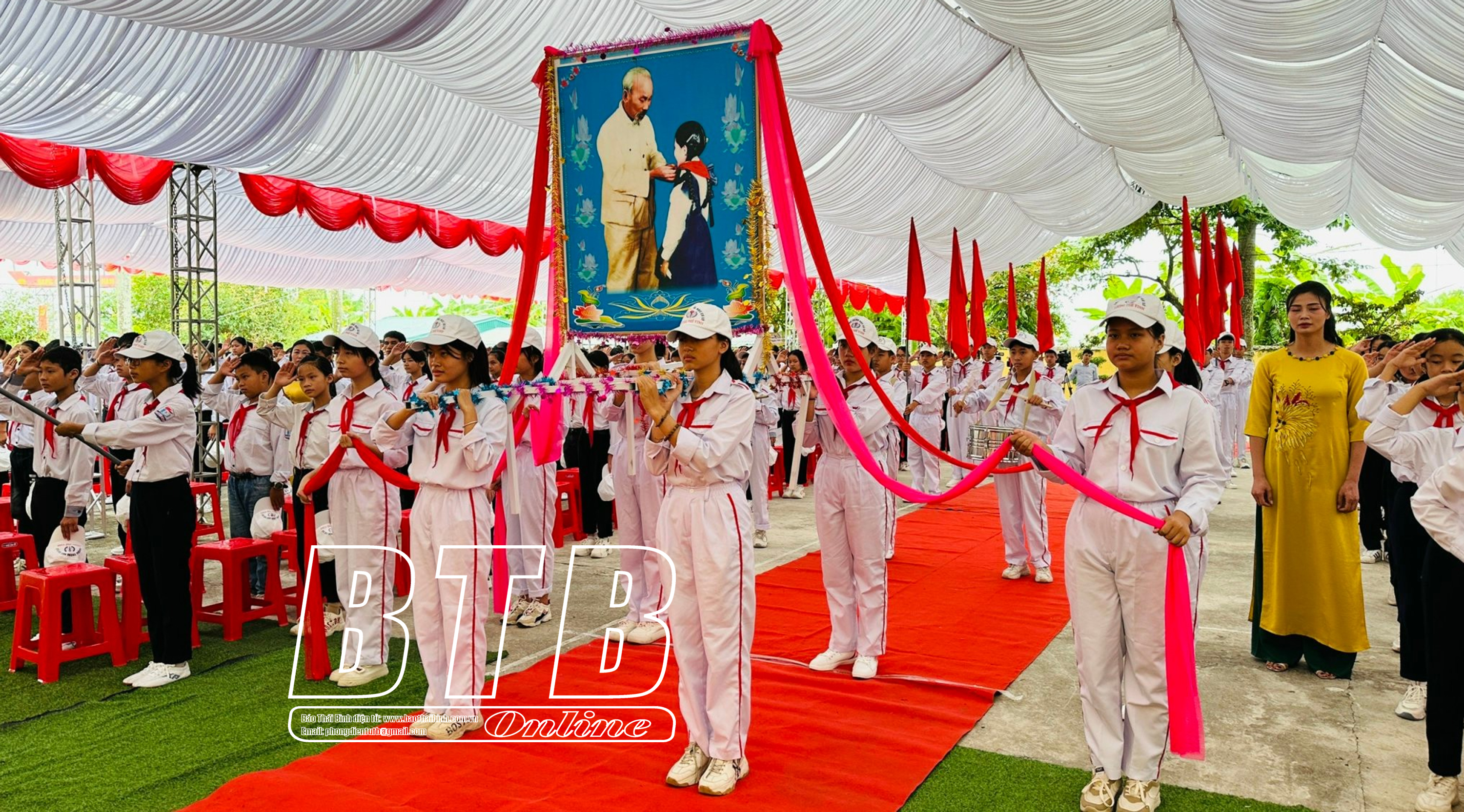 Các em học sinh Trường THCS Lương Thế Vinh chào đón các đồng chí lãnh đạo tỉnh, lãnh đạo sở, ngành, huyện Kiến Xương về dự khai giảng năm học mới.