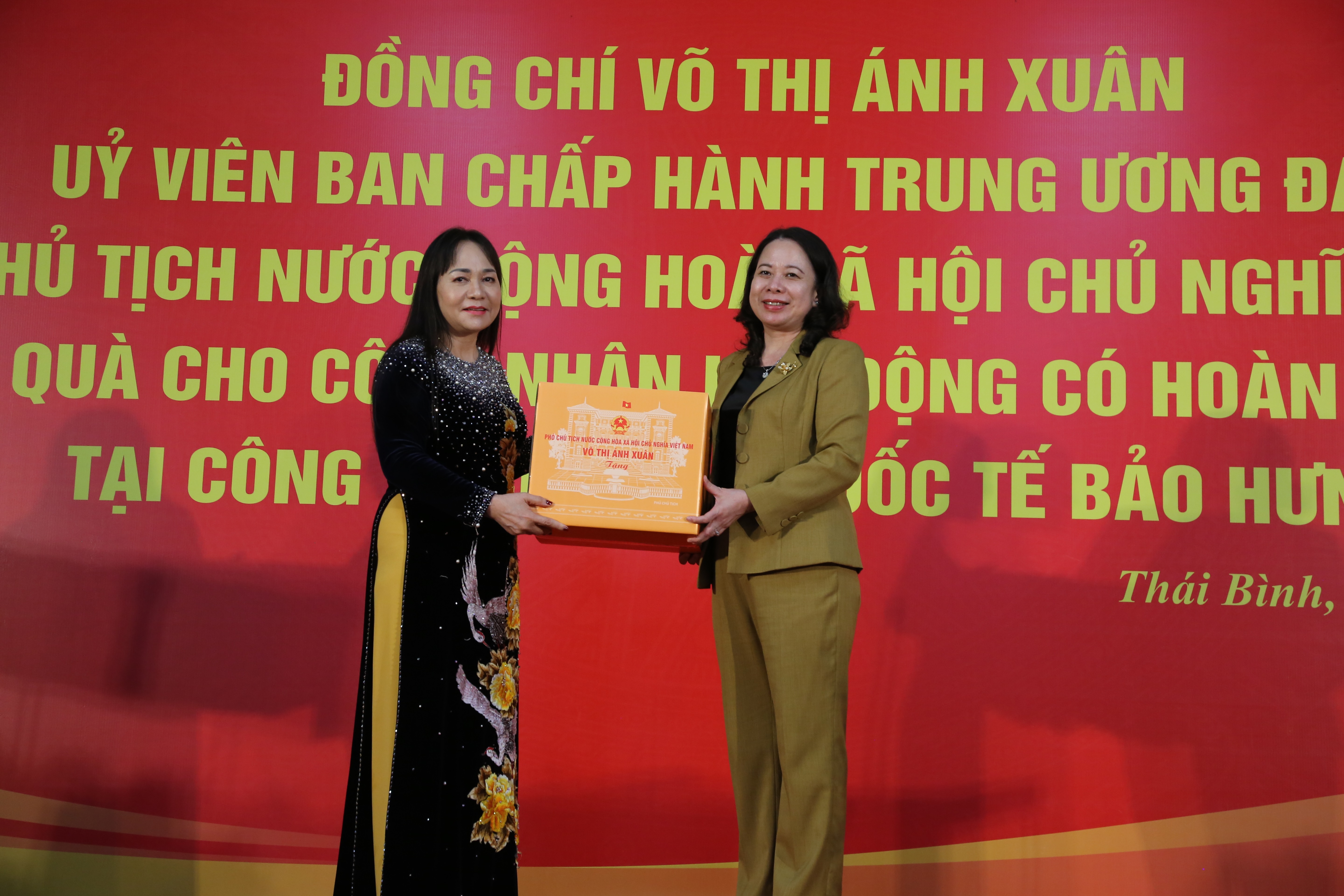 Đồng chí Võ Thị Ánh Xuân, Ủy viên Ban Chấp hành Trung ương Đảng, Phó Chủ tịch nước tặng quà cho công nhân có hoàn cảnh khó khăn của Công ty Cổ phần Quốc tế Bảo Hưng.