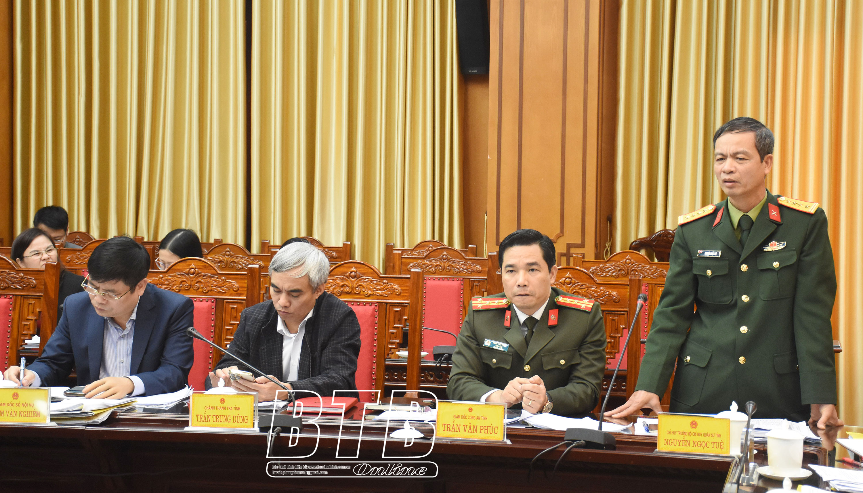 Đại tá Trần Văn Phúc, Ủy viên Ban Thường vụ Tỉnh ủy, Giám đốc Công an tỉnh phát biểu tại cuộc họp.