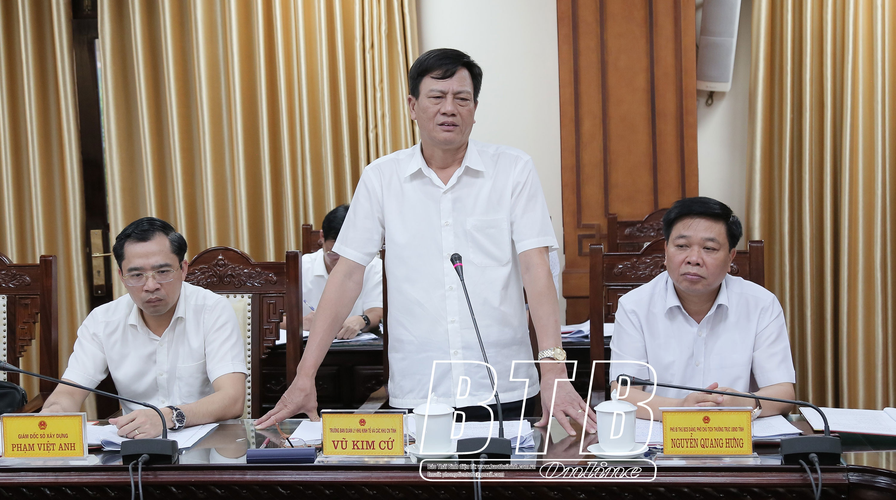 Đồng chí Vũ Kim Cứ, Ủy viên Ban Thường vụ Tỉnh ủy, Trưởng ban Quản lý Khu kinh tế và các khu công nghiệp tỉnh phát biểu tại cuộc họp.