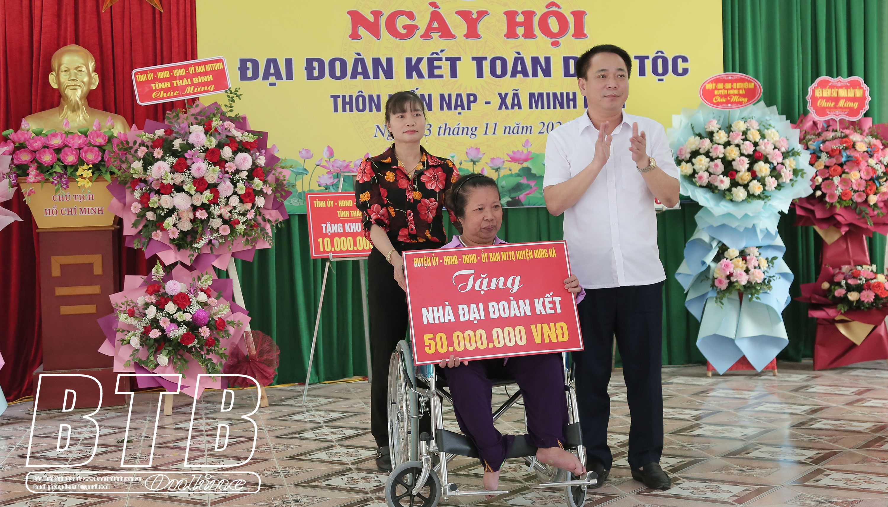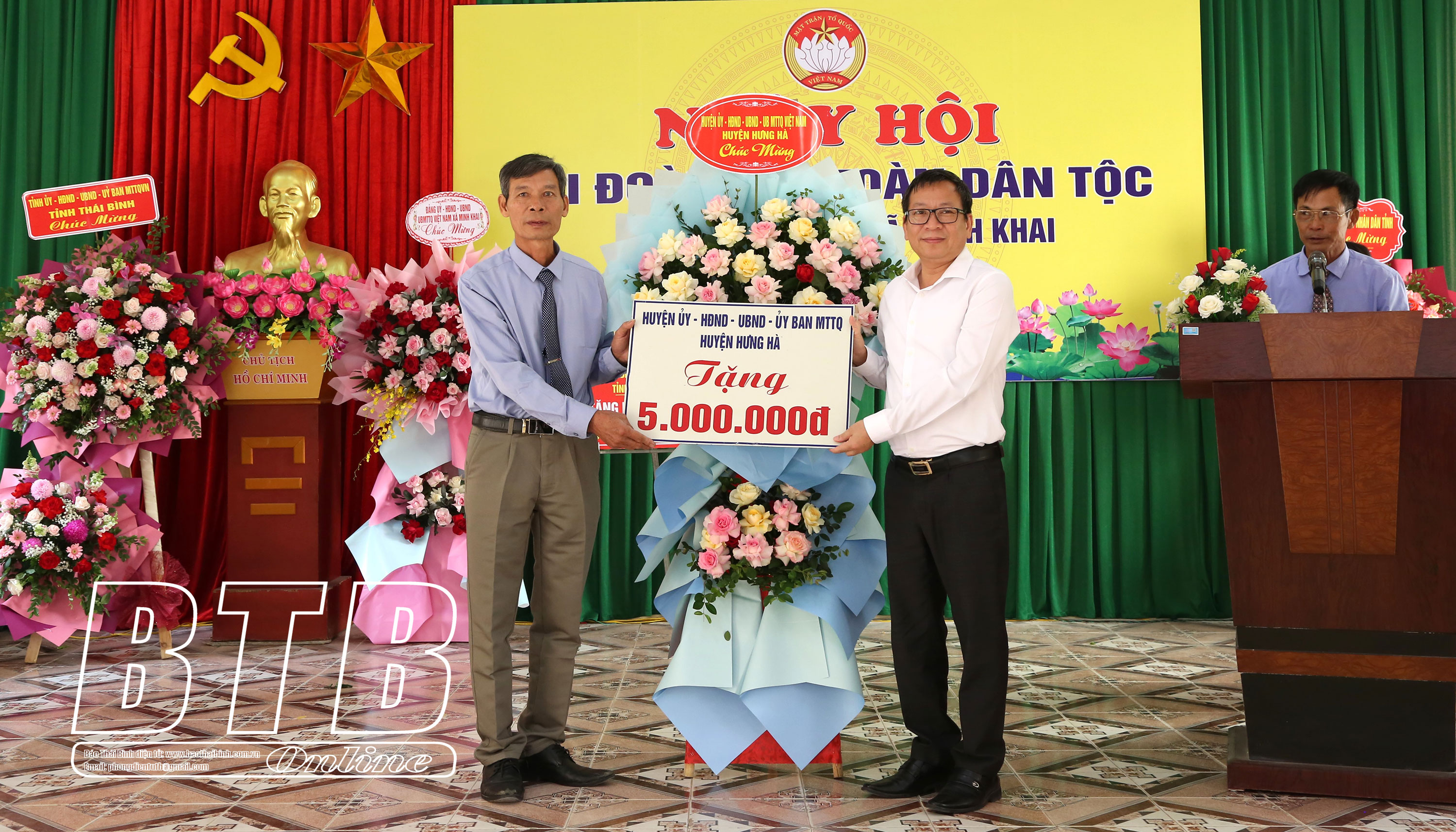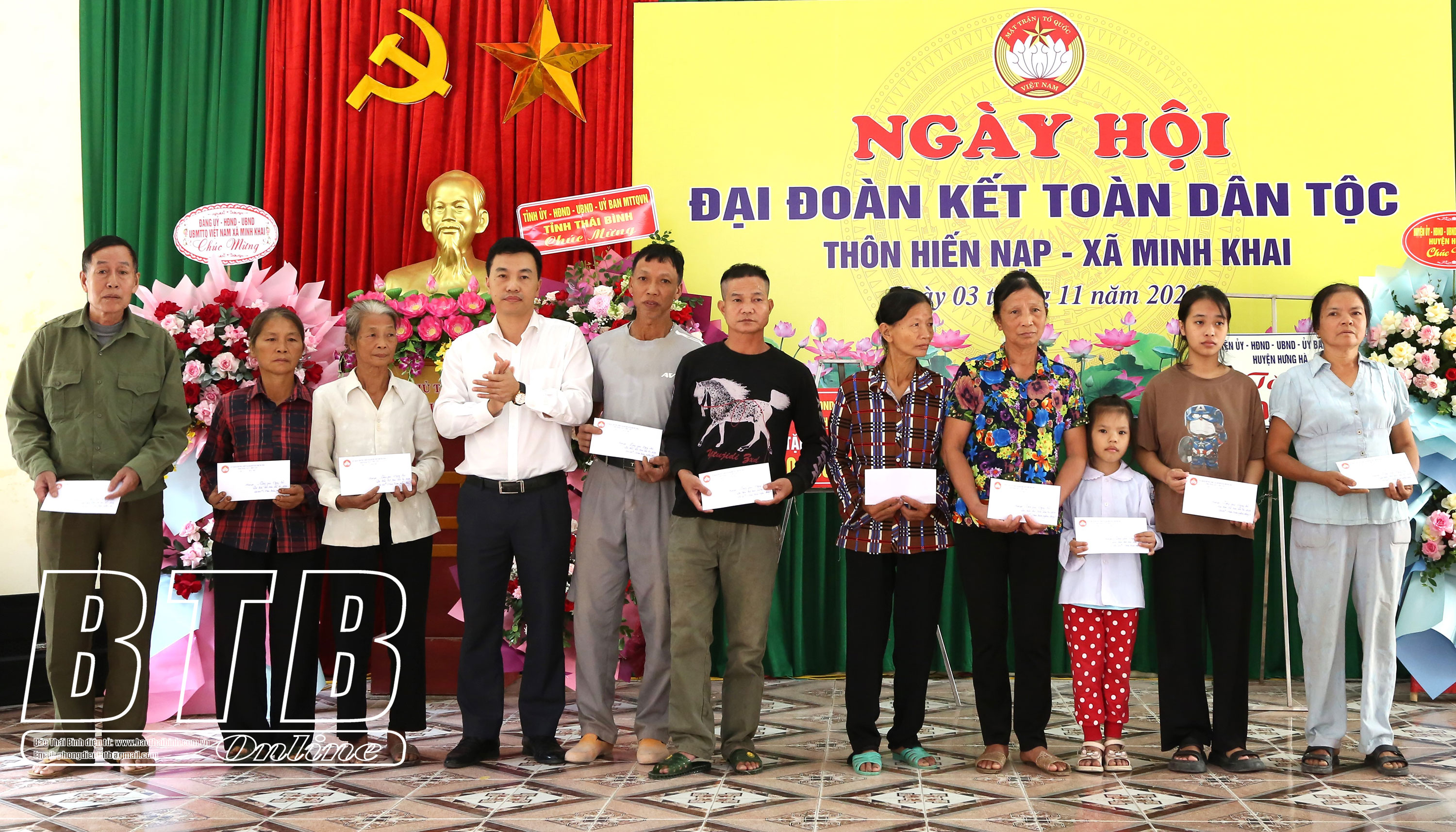 Nhân dịp này, các đồng chí lãnh đạo tỉnh, lãnh đạo các sở, ngành, huyện Hưng Hà đã tặng hoa chúc mừng và trao quà cho thôn Hiến Nạp; trao quà cho các hộ nghèo, hộ cận nghèo; trao kinh phí xây nhà đại đoàn kết cho hộ gia đình có hoàn cảnh khó khăn.