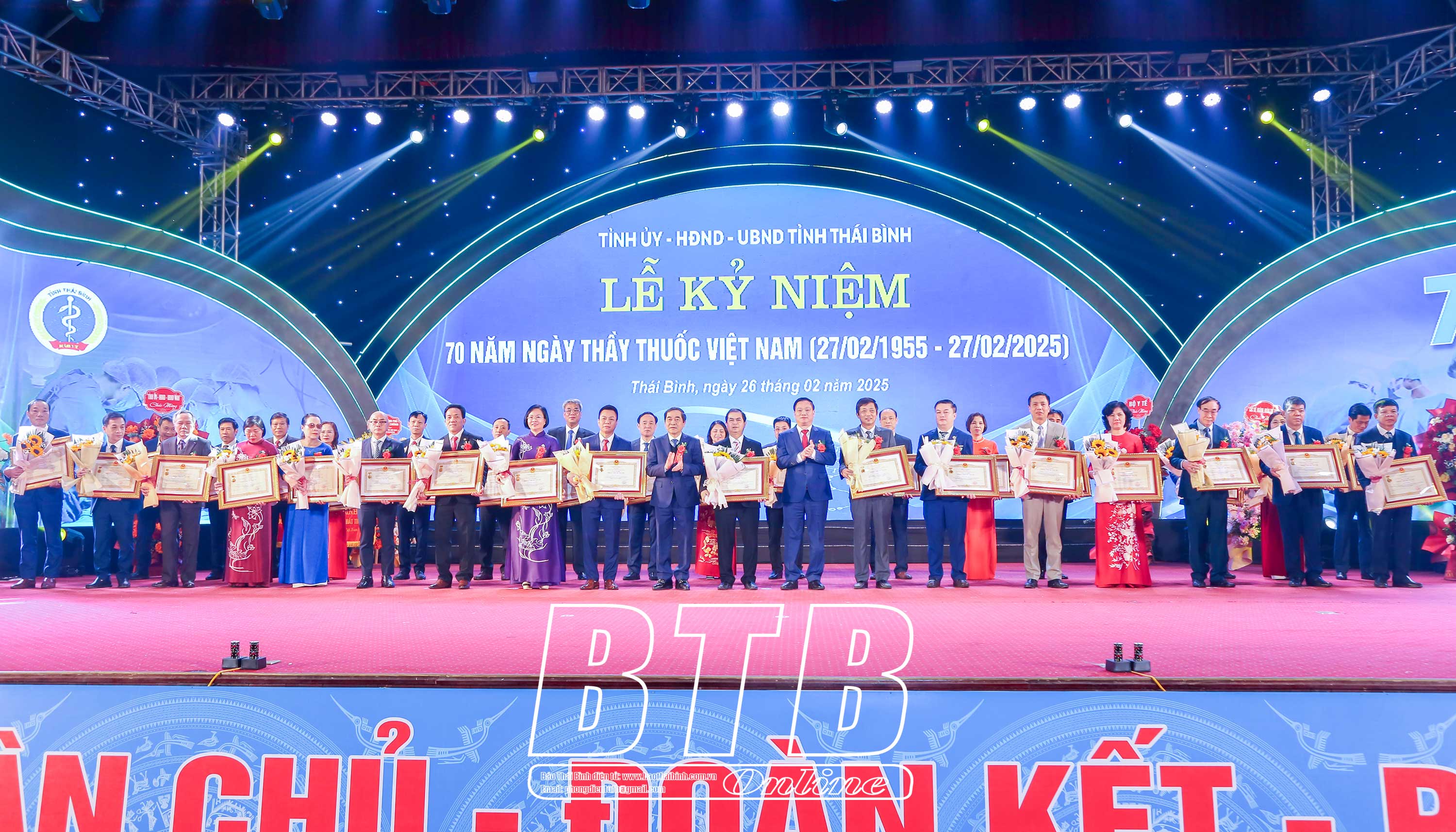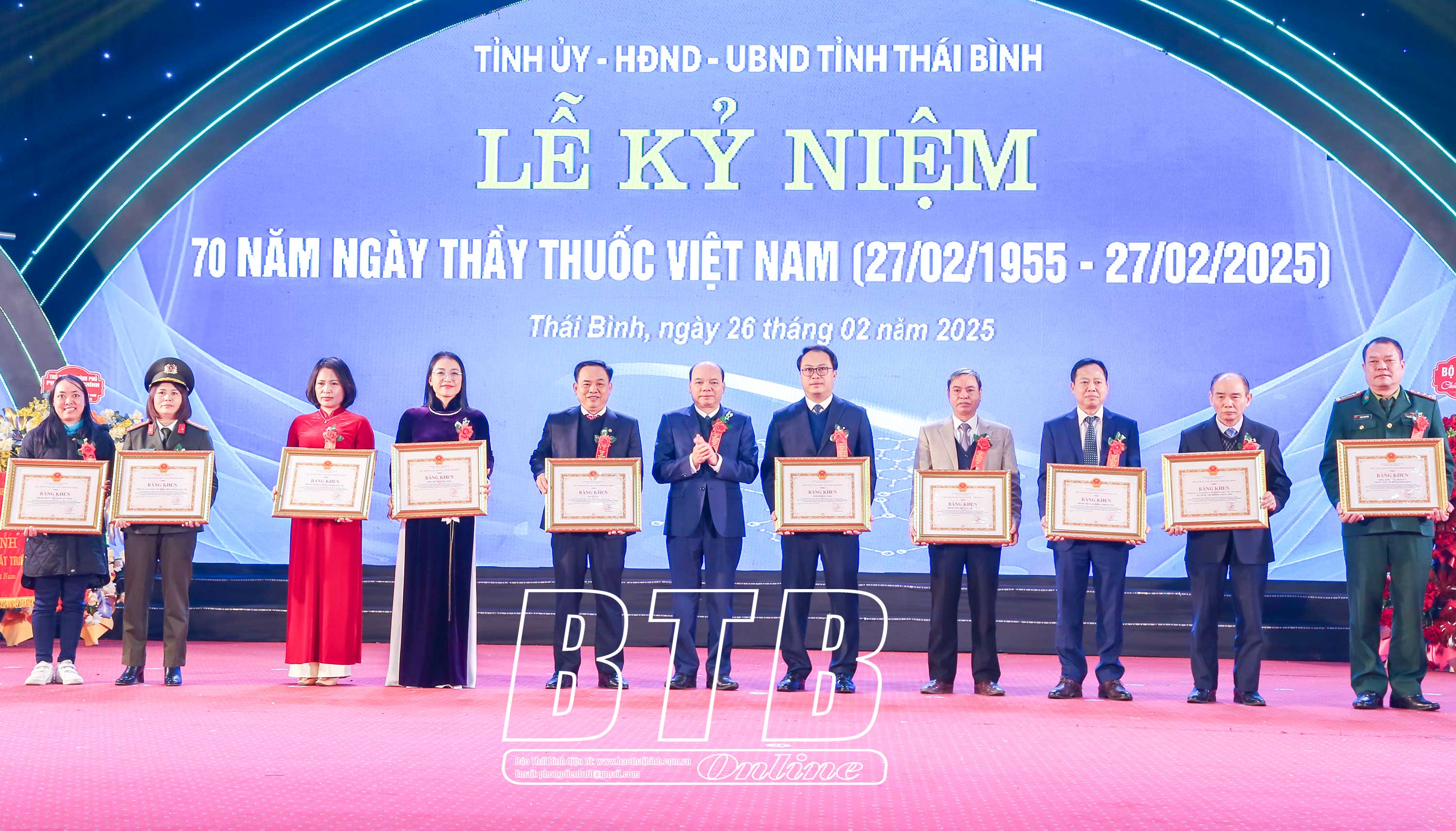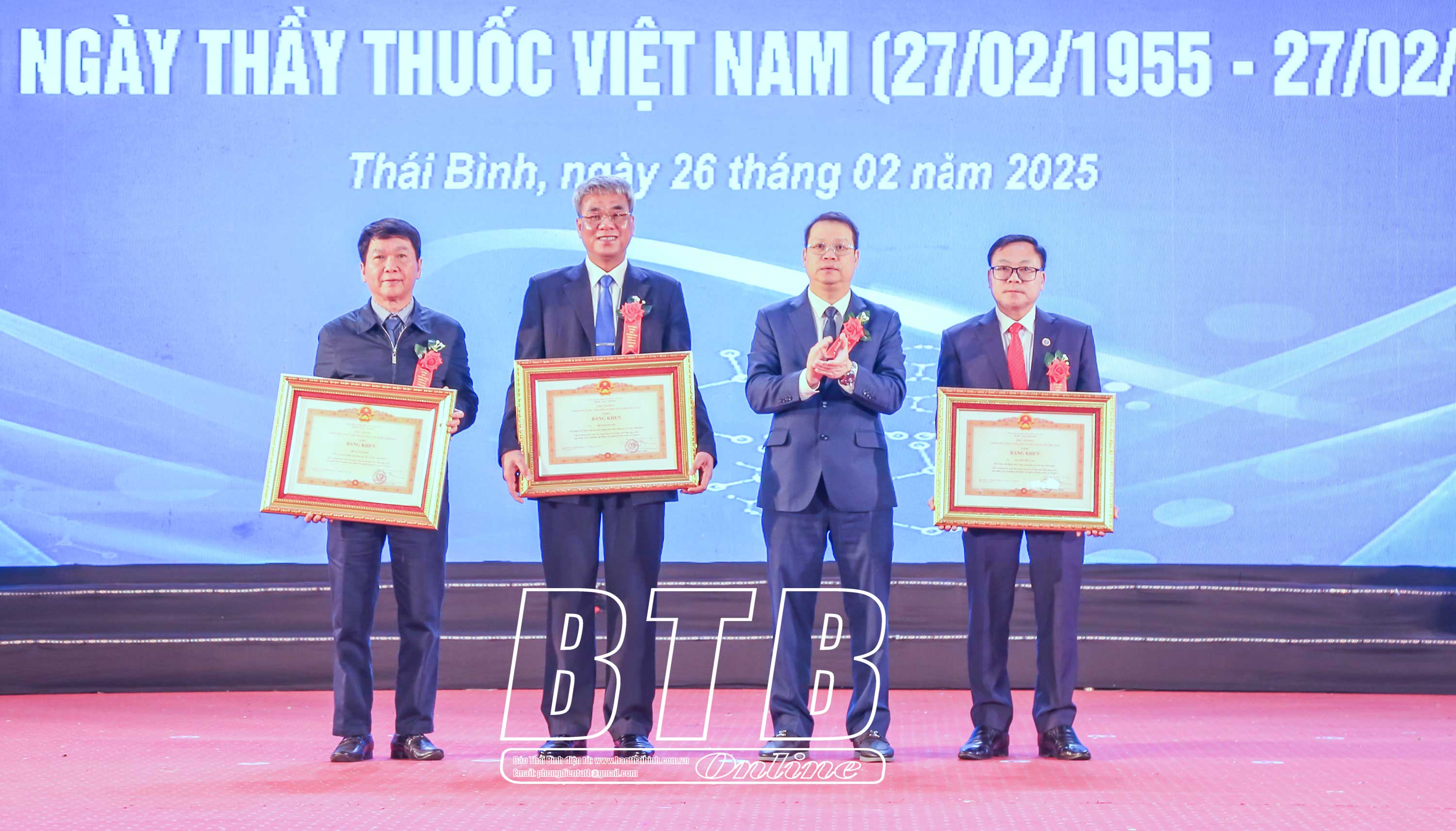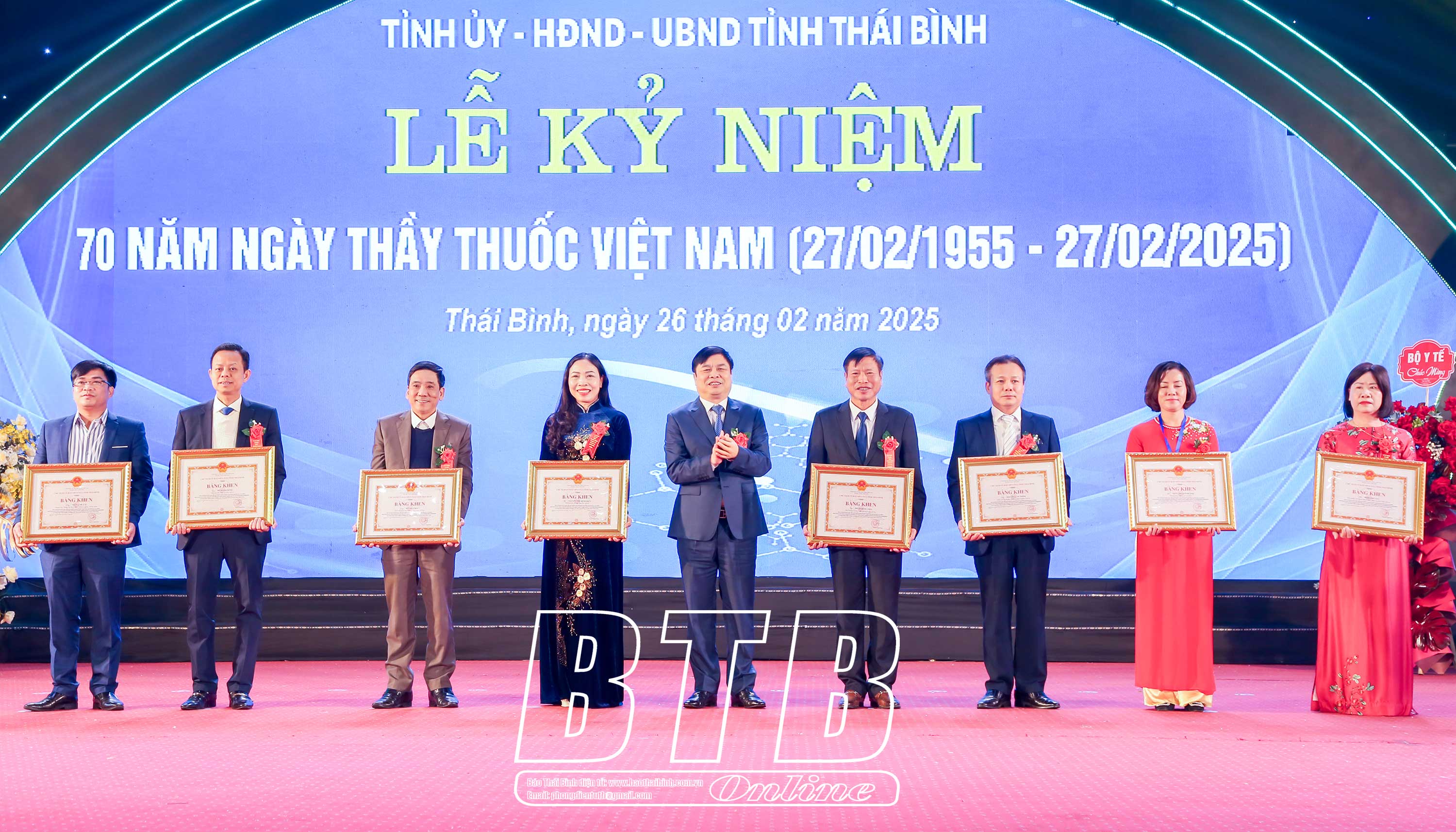 Nhân dịp này, thừa ủy quyền của Chủ tịch nước, đồng chí Nguyễn Khắc Thận, Bí thư Tỉnh ủy và đồng chí Nguyễn Tiến Thành, Phó Bí thư thường trực Tỉnh ủy, Chủ tịch HĐND tỉnh đã trao quyết định phong tặng Thầy thuốc ưu tú và tặng hoa chúc mừng cho 35 cá nhân. Đồng chí Nguyễn Mạnh Hùng, Phó Bí thư Tỉnh ủy, Chủ tịch UBND tỉnh trao bằng khen của Thủ tướng Chính phủ cho 3 cá nhân. Tỉnh ủy, HĐND, UBND tỉnh đã trao tặng cho ngành bức trướng mang dòng chữ: "Ngành y tế Thái Bình: Đoàn kết - Tận tụy - Sáng tạo - Phát triển". 30 tập thể, cá nhân có thành tích xuất sắc được nhận bằng khen của Chủ tịch UBND tỉnh.