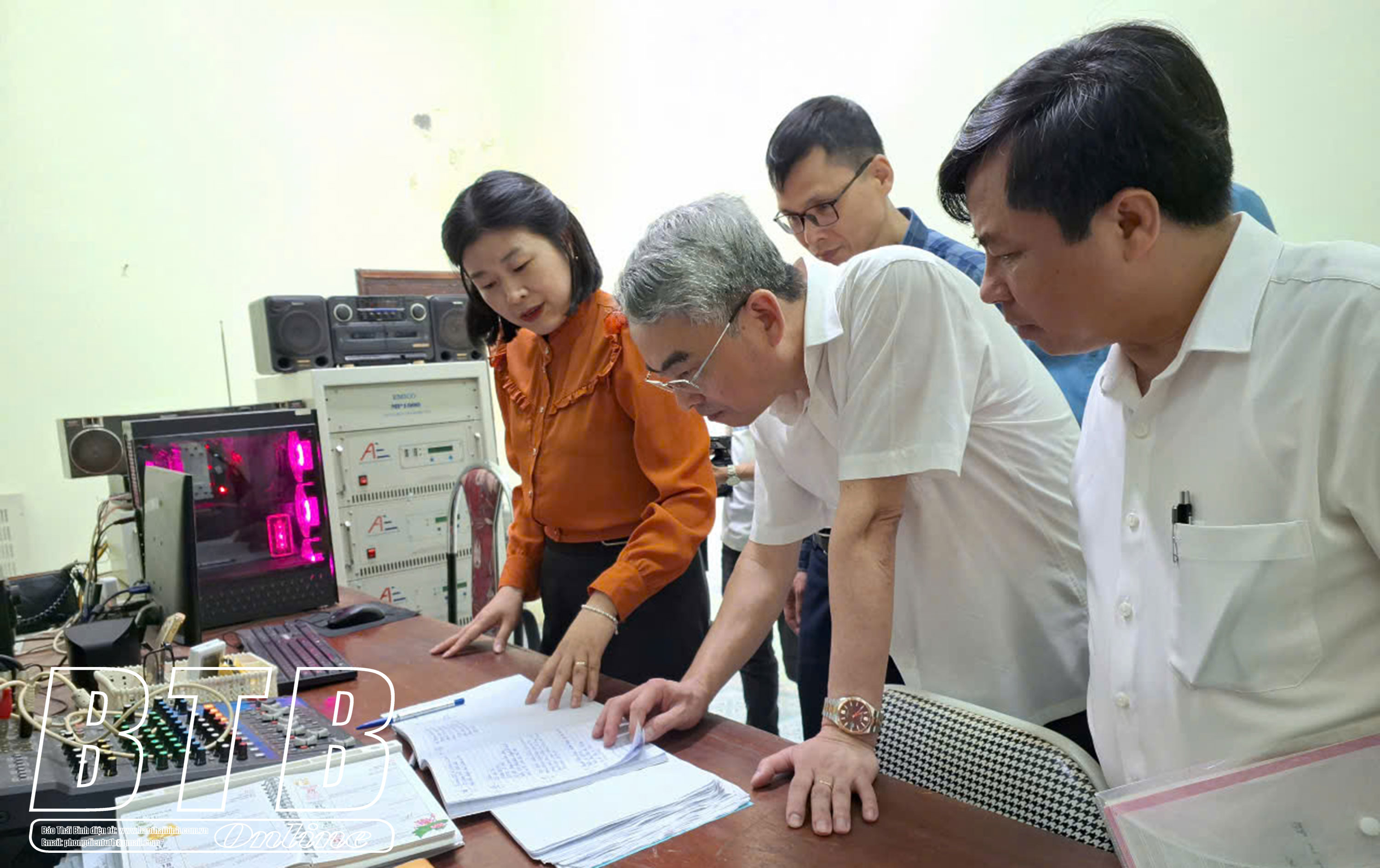 Đồng chí Phạm Đồng Thụy, Ủy viên Ban Thường vụ Tỉnh ủy, Trưởng Ban Tuyên giáo và Dân vận Tỉnh ủy kiểm tra chương trình phát thanh tại Trung tâm Văn hóa thể thao huyện Tiền Hải.