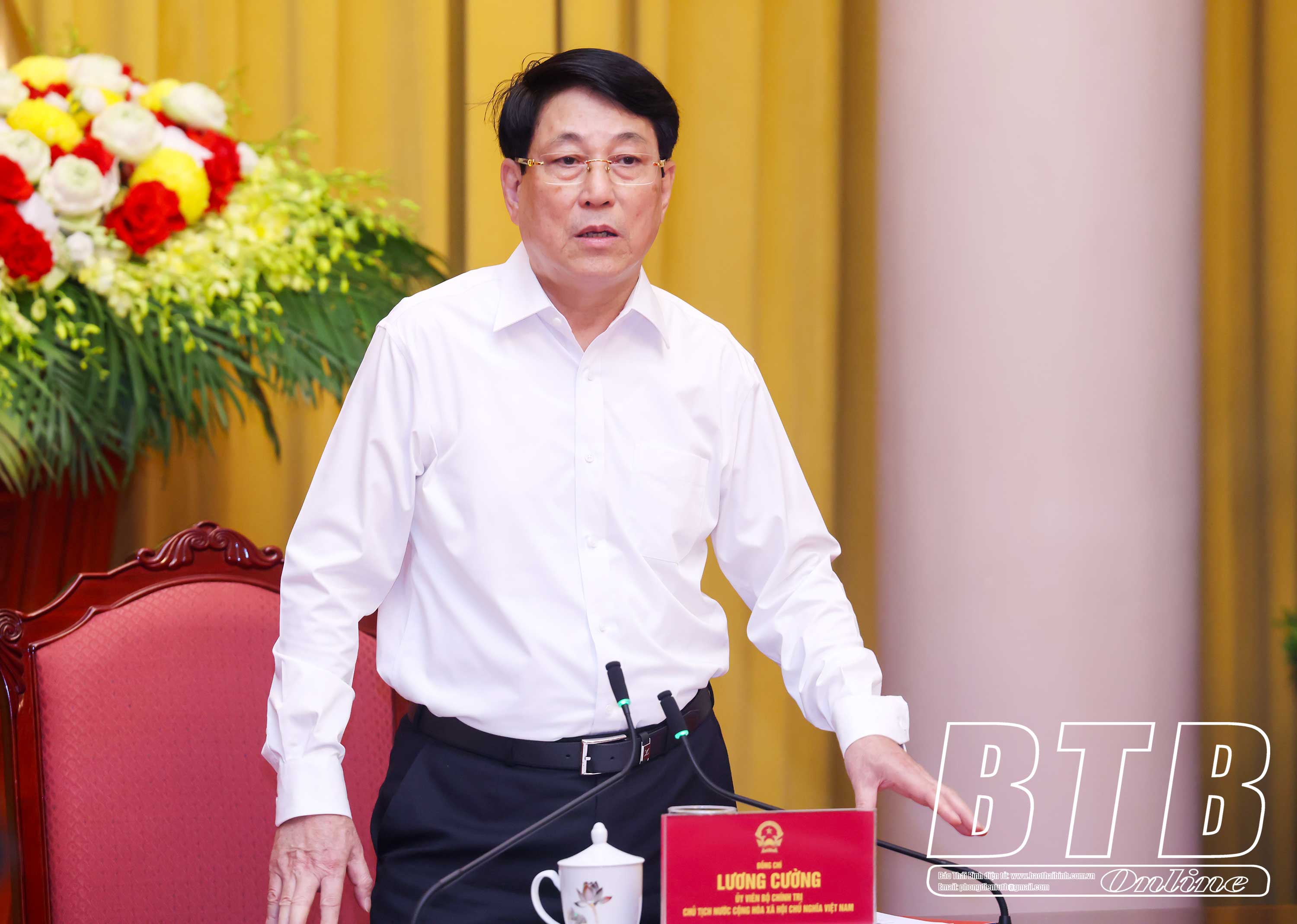 Phát biểu kết luận buổi làm việc, Chủ tịch nước Lương Cường đánh giá cao sự chủ động phối hợp chặt chẽ, nghiêm túc giữa Ban Thường vụ Tỉnh ủy Hưng Yên với Ban Thường vụ Tỉnh ủy Thái Bình, giữa các sở, ban, ngành của hai tỉnh trong việc cụ thể hóa các nghị quyết, kết luận của Trung ương phù hợp với tình hình thực tiễn của địa phương; thực hiện đề án sắp xếp đơn vị hành chính; trong công tác sắp xếp nhân sự và chuẩn bị văn kiện cho Đại hội Đảng bộ tỉnh mới sau khi hợp nhất, tạo được sự thống nhất cao trong Đảng bộ, trong đội ngũ cán bộ, đảng viên và nhân dân hai tỉnh.