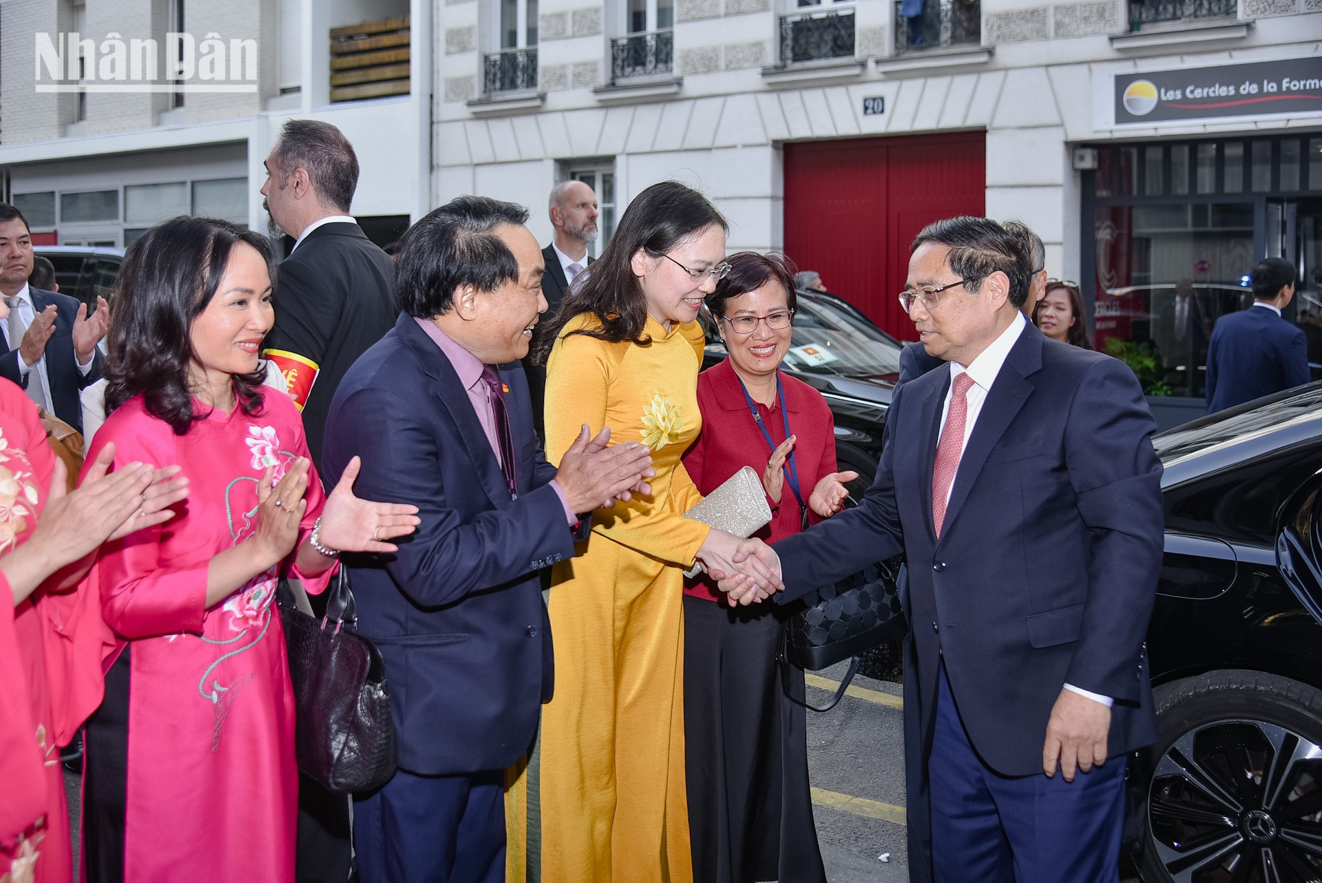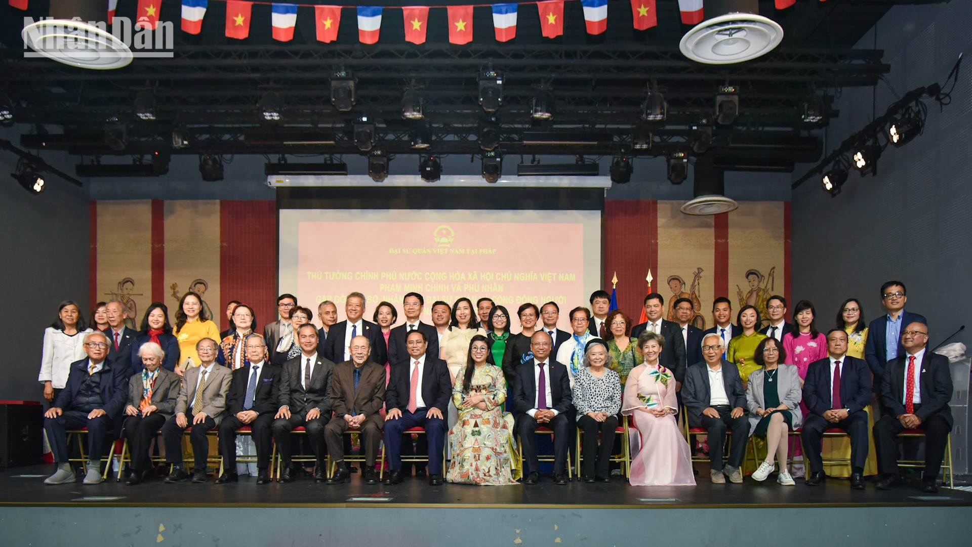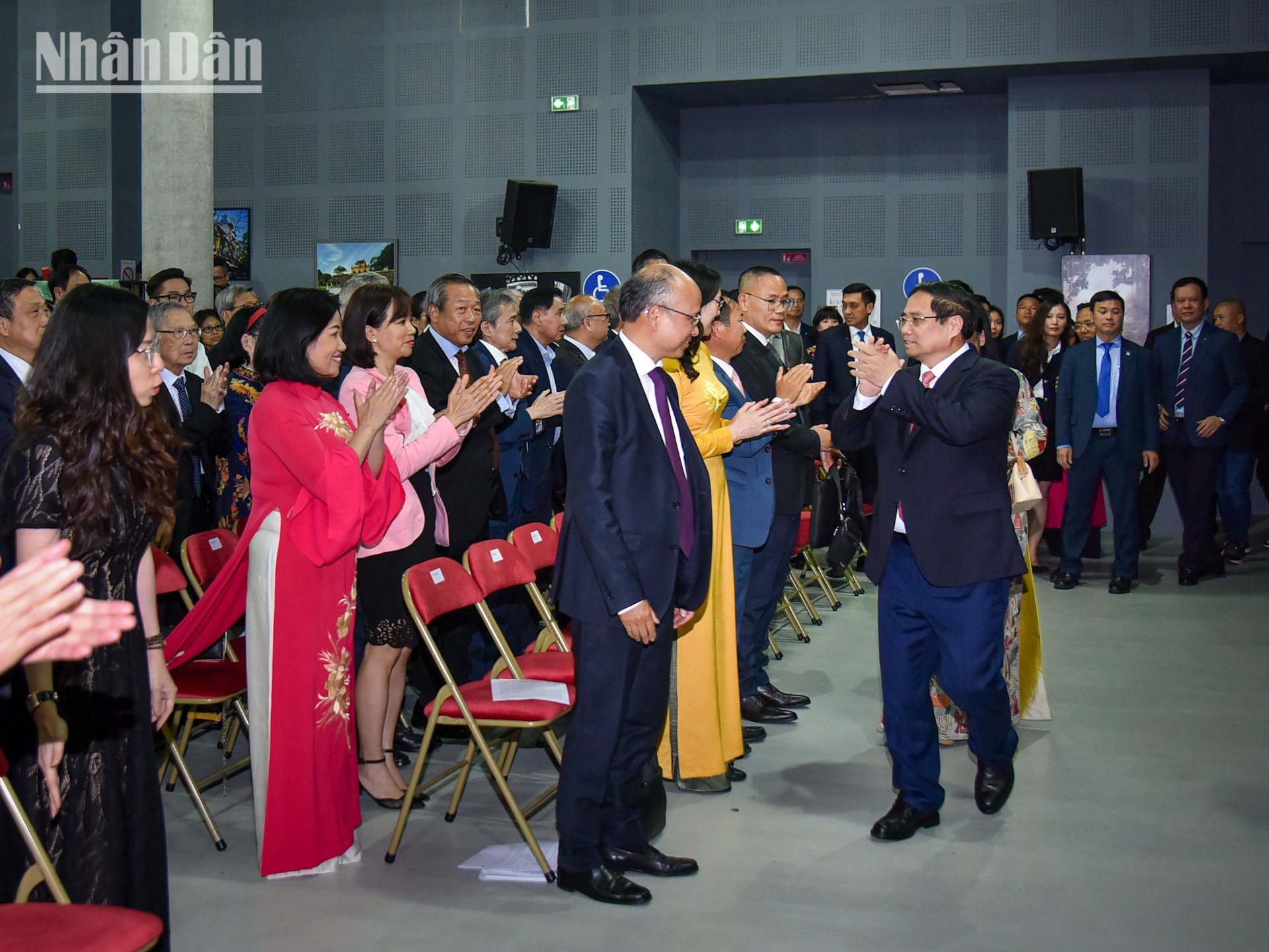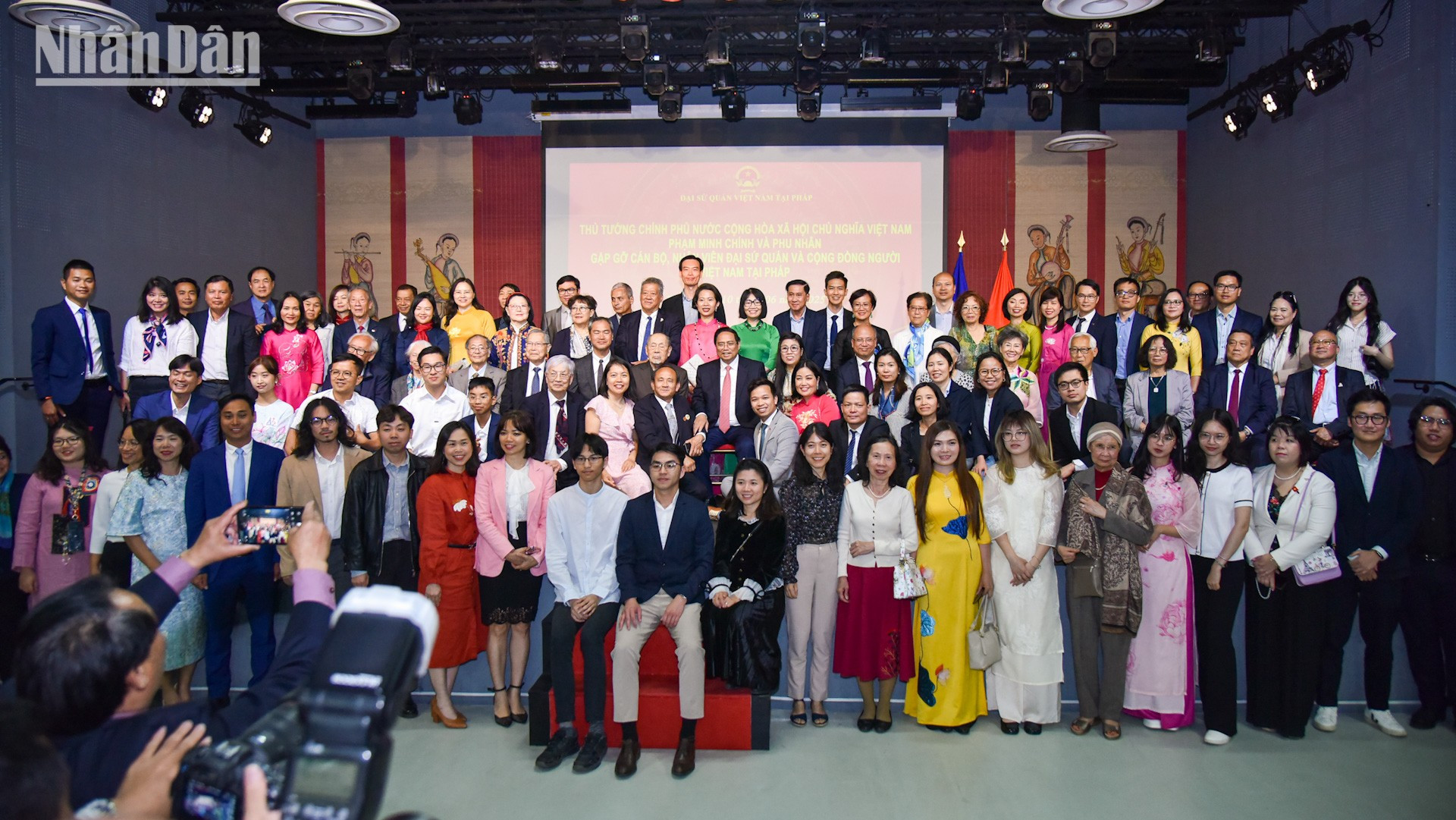Cán bộ, nhân viên các cơ quan đại diện và kiều bào tại Pháp vui mừng chào đón Thủ tướng Phạm Minh Chính và Phu nhân tới dự cuộc gặp với cộng đồng người Việt được tổ chức ở Trung tâm Văn hóa Việt Nam tại Pháp.