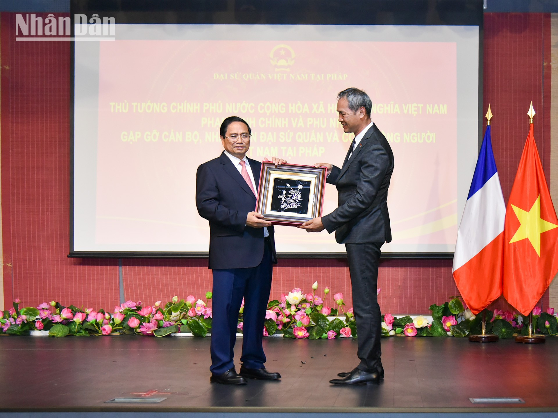 Trao quà lưu niệm tặng đại diện Hội người Việt Nam tại Pháp, Thủ tướng Phạm Minh Chính nhấn mạnh rằng cộng đồng người Việt tại Pháp là điển hình cho phong trào yêu nước của cộng đồng người Việt trên toàn thế giới.