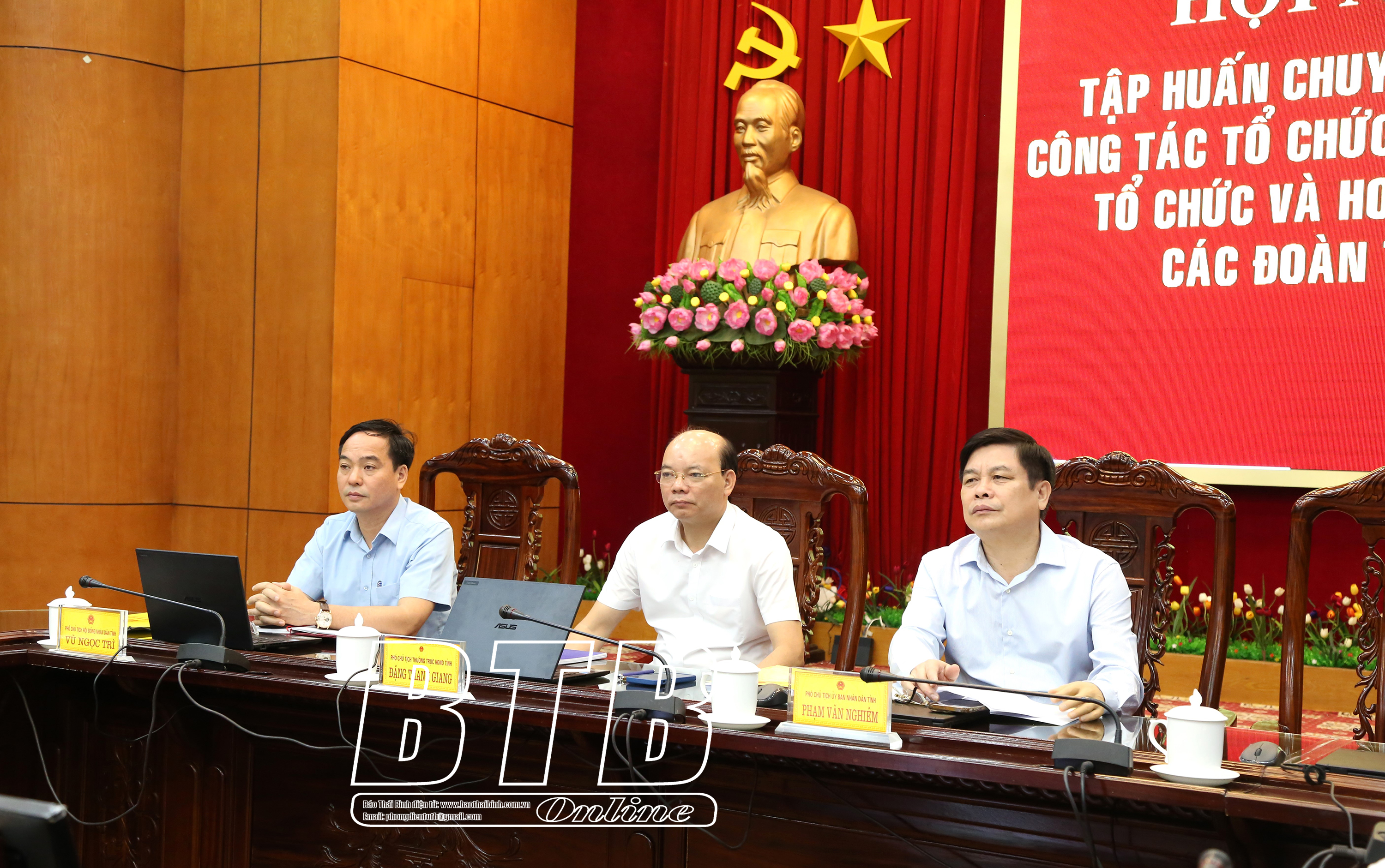 Các đồng chí lãnh đạo HĐND, UBND tỉnh dự hội nghị tại điểm cầu UBND tỉnh Thái Bình.