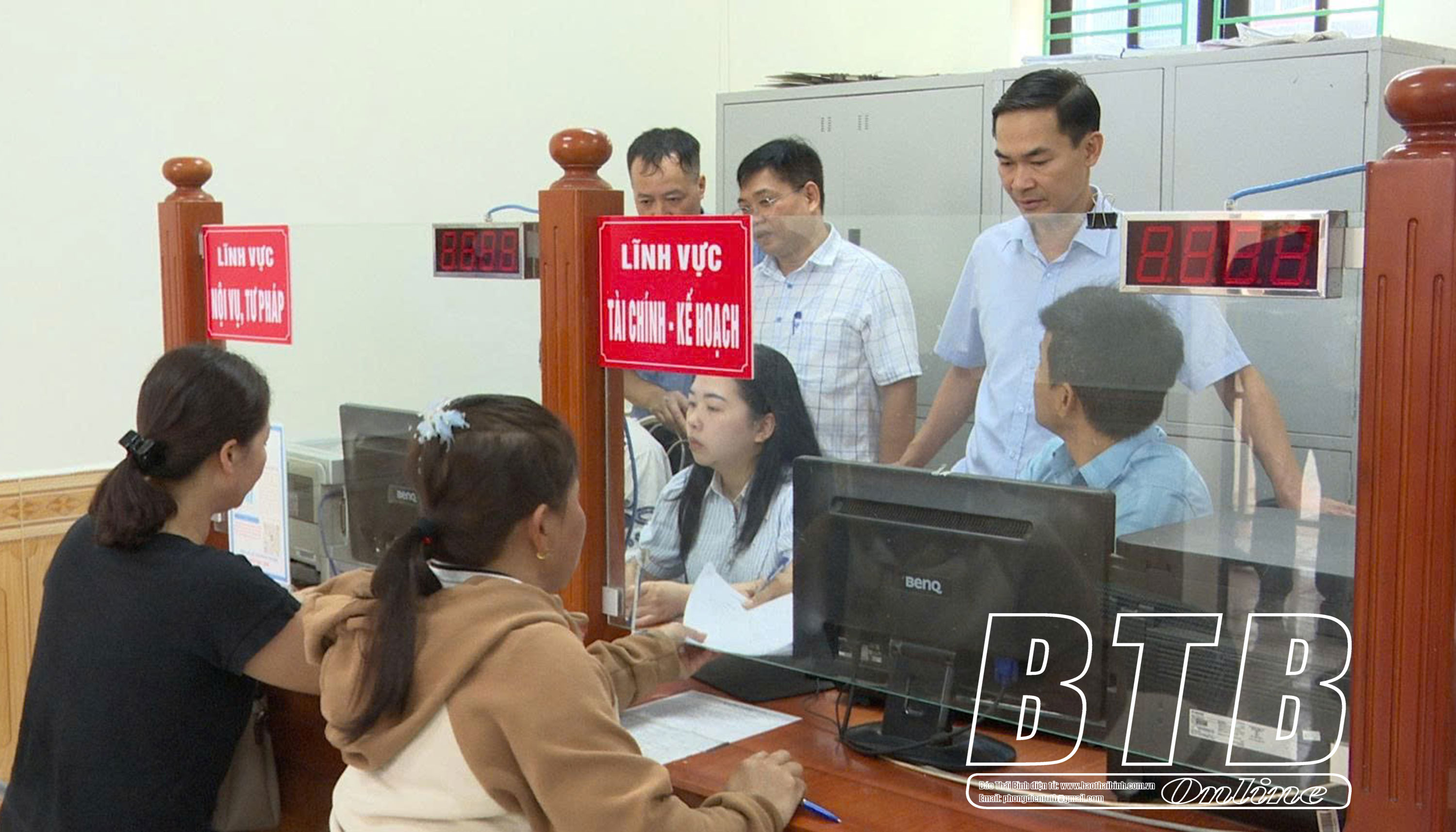 Các đồng chí lãnh đạo huyện kiểm tra trang thiết bị và công tác vận hành Trung tâm phục vụ hành chính công xã Kiến Xương.