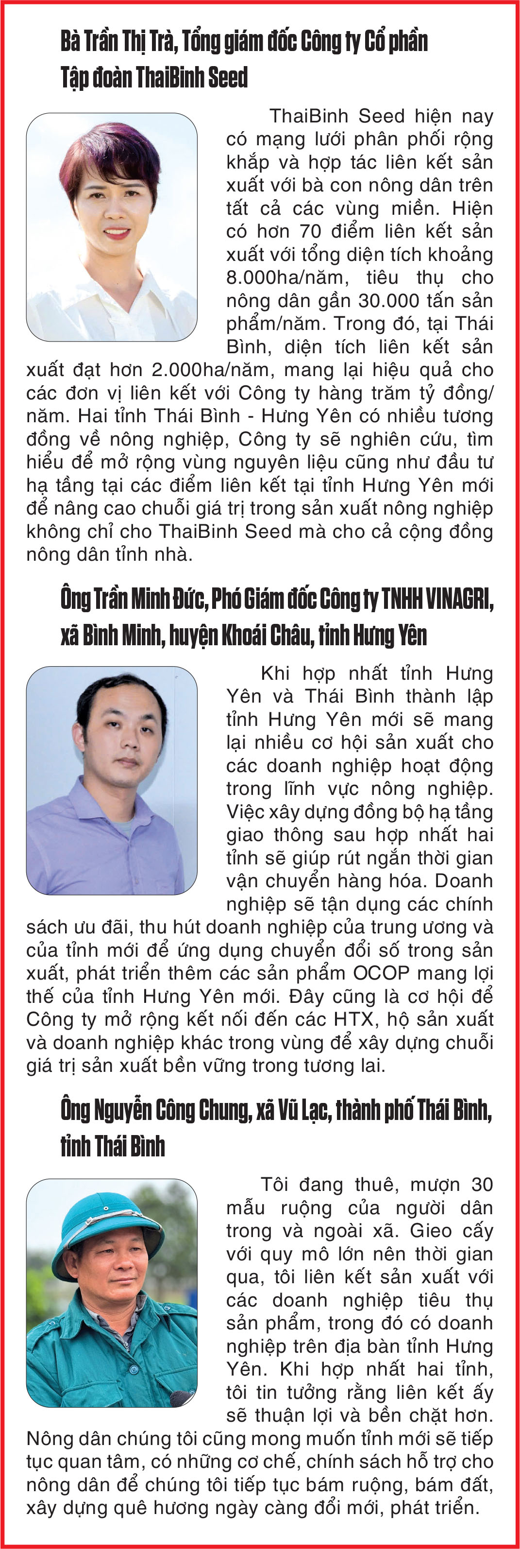 Khẳng định tiềm năng, động lực mới cho phát triển nông nghiệp của hai tỉnh Hưng Yên và Thái Bình, đồng chí Nguyễn Văn Tráng, Phó Giám đốc Sở Nông nghiệp và Môi trường tỉnh Hưng Yên cho rằng: Truyền thống văn hóa, lịch sử, mảnh đất và con người hai tỉnh có nhiều nét tương đồng, người dân cần cù, năng động, sáng tạo trong lao động. Đặc biệt, trong sản xuất nông nghiệp hai tỉnh đều có thế mạnh, mang đặc thù tiêu biểu của miền Bắc và cả nước như: tài nguyên đất cho sản xuất nông nghiệp phì nhiêu, màu mỡ, thời tiết, khí hậu hài hòa, do vậy tạo thuận lợi cho sản xuất lúa hàng hóa, năng suất, hiệu quả kinh tế cao; hình thành nhiều vùng chuyên canh, tập trung trồng cây ăn quả đặc sản như nhãn, vải, cam... Hơn nữa, vị trí địa lý của hai tỉnh có sự tương đồng, kết nối với các vùng kinh tế trọng điểm, tạo điều kiện cho giao thương nông sản nội tỉnh và các địa phương trong vùng và cả nước. Ngoài ra, với chủ trương thu hút đầu tư lĩnh vực công nghiệp, thương mại, dịch vụ... hai tỉnh đều có thế mạnh thu hút đầu tư doanh nghiệp thu mua, chế biến nông sản, tạo động lực cho nông dân đẩy mạnh sản xuất.
