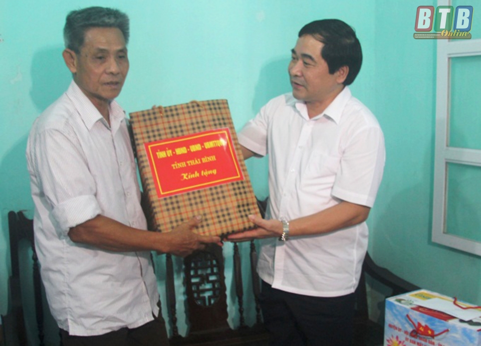 Đồng chí Đặng Trọng Thăng, Phó Bí thư thường trực Tỉnh ủy, Chủ tịch HĐND tỉnh tặng quà ông Hà Ngọc Uông là bố liệt sĩ, thôn An Phú, xã An Bồi (Kiến Xương).