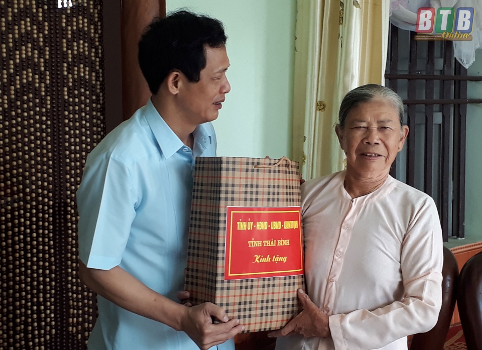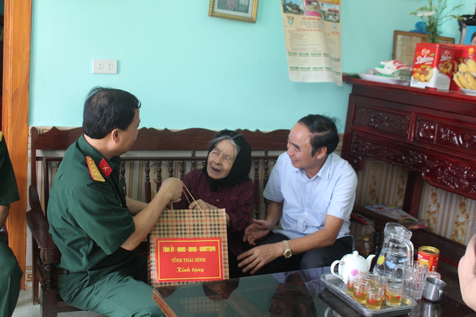 Các đồng chí: Vũ Đức Hằng, Ủy viên Ban Thường vụ, Trưởng ban Nội chính Tỉnh ủy; Nguyễn Đức Dũng, Ủy viên Ban Thường vụ Tỉnh ủy, Chỉ huy trưởng Bộ CHQS tỉnh; lãnh đạo huyện Vũ Thư đã đến thăm hỏi, tặng quà Bà mẹ Việt Nam anh hùng Ngô Thị Nhớn, 96 tuổi, có 10 người con, trong đó 2 người con đã hy sinh trong cuộc kháng chiến chống Mỹ cứu nước và thương binh 1/4 Phạm Duy Thiện, thôn Mỹ Lộc 1, xã Việt Hùng.