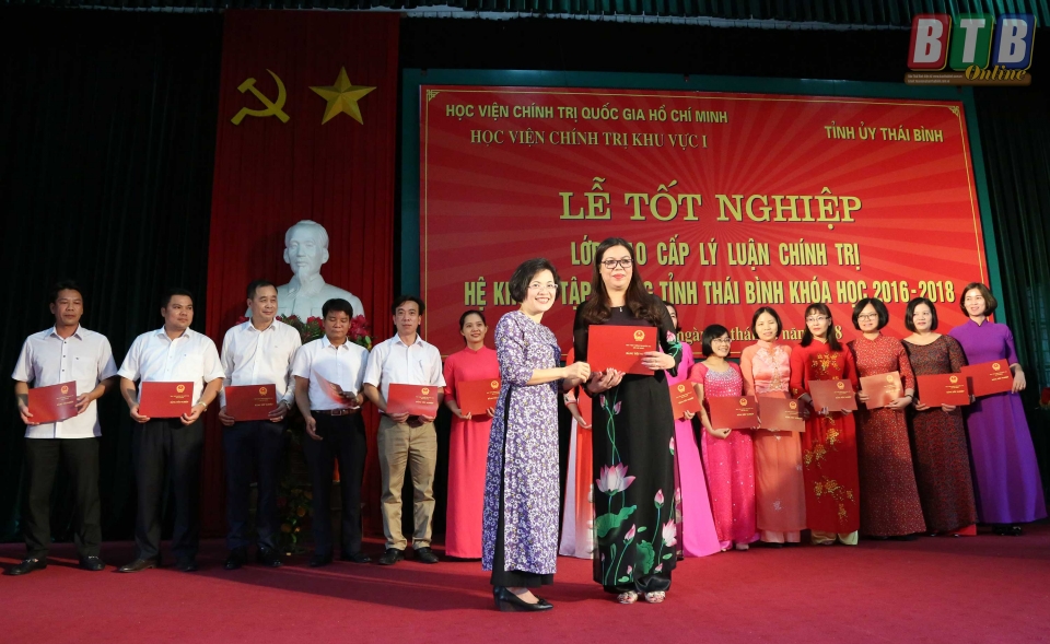 Lớp Cao cấp lý luận chính trị hệ không tập trung tại Thái Bình khóa 10 khai giảng tháng 6/2016 tại Trường Chính trị tỉnh. Kế hoạch, chương trình học tập của lớp được thực hiện nghiêm túc, đúng tiến độ. Sau 2 năm học tập, các học viên đã có nhiều cố gắng sắp xếp thời gian, công việc, vượt qua khó khăn, tham gia học tập nghiêm túc, trách nhiệm, hoàn thành toàn bộ chương trình của khóa học. 88 đồng chí được Học viện Chính trị khu vực 1 cấp bằng tốt nghiệp. Trong đó, kết quả rèn luyện: 84 đồng chí xếp loại xuất sắc, 4 đồng chí xếp loại giỏi; kết quả học tập: 16 đồng chí xếp loại giỏi, 72 đồng chí xếp loại khá; 2 học viên được Giám đốc Học viện Chính trị khu vực 1 tặng Bằng khen vì có thành tích xuất sắc trong học tập.