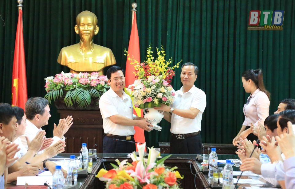 Đồng chí Đàm Văn Vượng, Ủy viên Ban Thường vụ Tỉnh ủy, Phó Chủ tịch thường trực HĐND tỉnh tặng hoa chúc mừng đồng chí Vũ Mạnh Thía. Ảnh: Thành Tâm