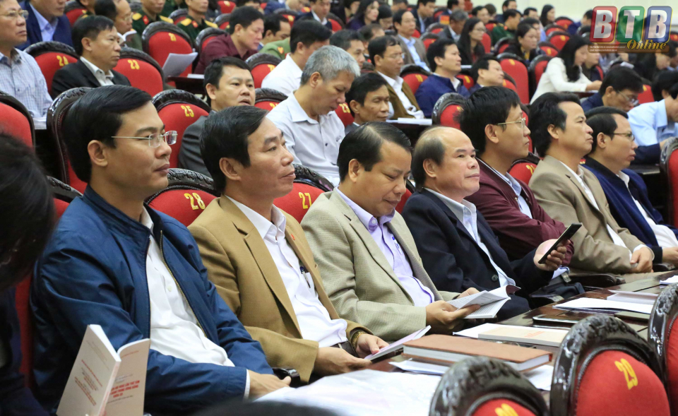 Dự hội nghị tại điểm cầu Thái Bình có các đồng chí: Nguyễn Hồng Diên, Ủy viên Trung ương Đảng, Bí thư Tỉnh ủy, Chủ tịch HĐND tỉnh, Trưởng đoàn đại biểu Quốc hội tỉnh; Đặng Trọng Thăng, Phó Bí thư Tỉnh ủy, Chủ tịch UBND tỉnh; Ngô Đông Hải, Ủy viên dự khuyết Trung ương Đảng, Phó Bí thư thường trực Tỉnh ủy; các đồng chí Ủy viên Ban Chấp hành Đảng bộ tỉnh; trưởng, phó các sở, ban, ngành, đoàn thể tỉnh, Trường Chính trị tỉnh, các trường đại học, cao đẳng trên địa bàn; báo cáo viên cấp tỉnh; các đồng chí ủy viên ban thường vụ, trưởng, phó ban tuyên giáo, chánh văn phòng huyện ủy, thành ủy, đảng ủy trực thuộc Tỉnh ủy; chủ tịch, phó chủ tịch HĐND, UBND, chánh văn phòng HĐND, UBND các huyện, thành phố.
