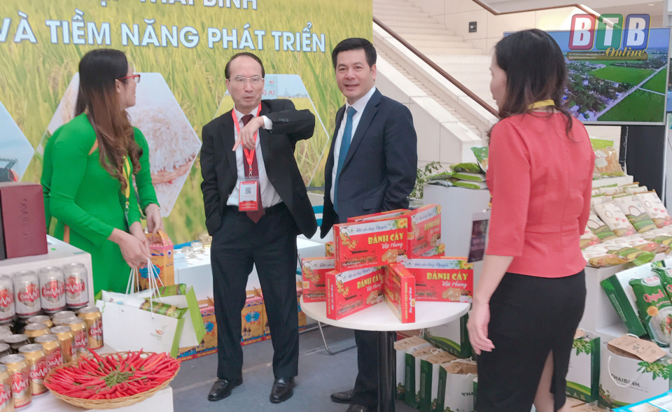 Đồng chí Nguyễn Hồng Diên, Ủy viên Trung ương Đảng, Bí thư Tỉnh ủy, Chủ tịch HĐND tỉnh thăm gian hàng của Thái Bình triển lãm tại hội nghị.