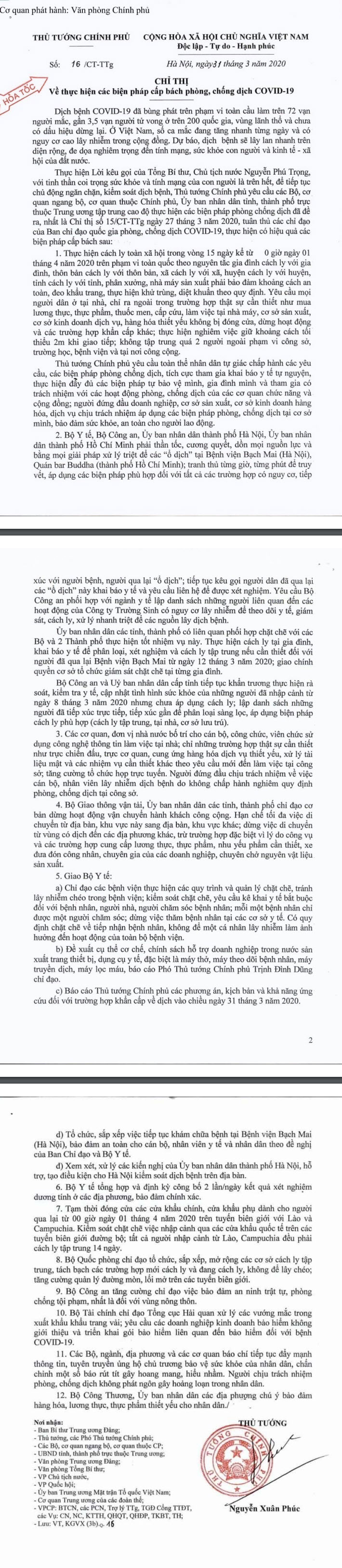 Ngày 31/3/2020, Thủ tướng Chính phủ ban hành Chỉ thị số 16/CT-TTg về thực hiện các biện pháp cấp bách phòng, chống dịch Covid-19.