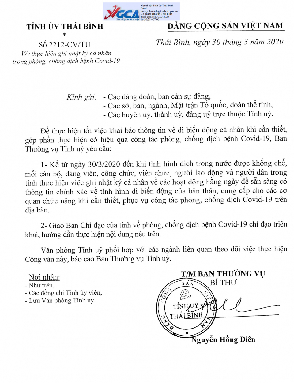 Ngày 30/3/2020, Tỉnh ủy Thái Bình ban hành Công văn số 2212-CV/TU về việc thực hiện ghi nhật ký cá nhân trong phòng, chống dịch bệnh Covid-19.