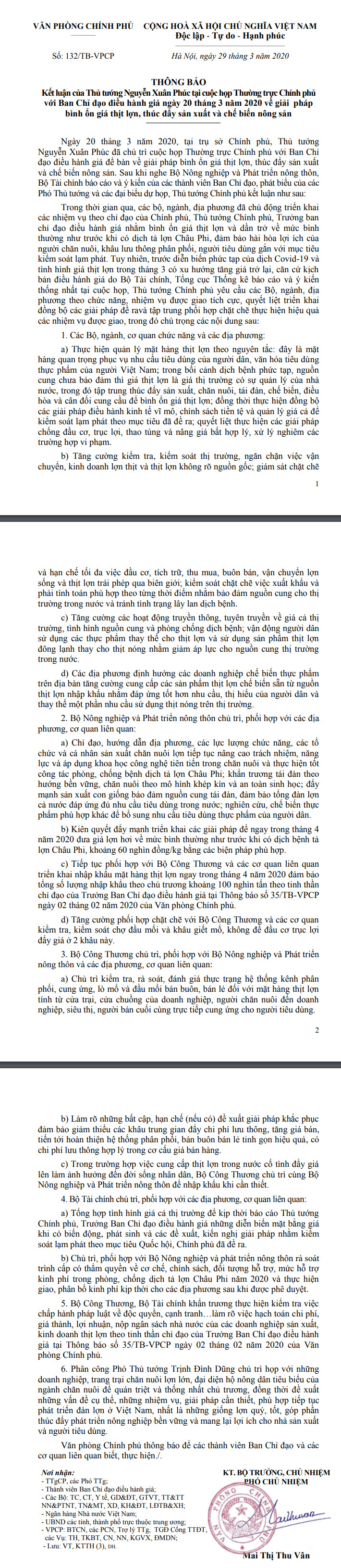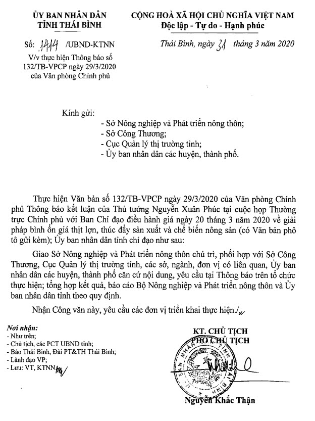 Ngày 31/3/2020, Ủy ban nhân dân tỉnh Thái Bình ban hành Công văn số 1414/UBND-KTNN về việc thực hiện Thông báo số 132/TB-VPCP ngày 29/3/2020 của Văn phòng Chính phủ.