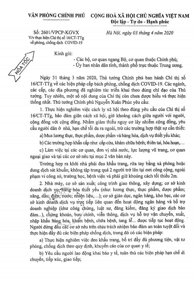 Ngày 04/4, UBND tỉnh ra công văn hỏa tốc số 1538/UBND-VX về việc thực hiện Công văn số 2601/VPCP-KGVX ngày 03/4/2020 của Văn phòng Chính phủ.