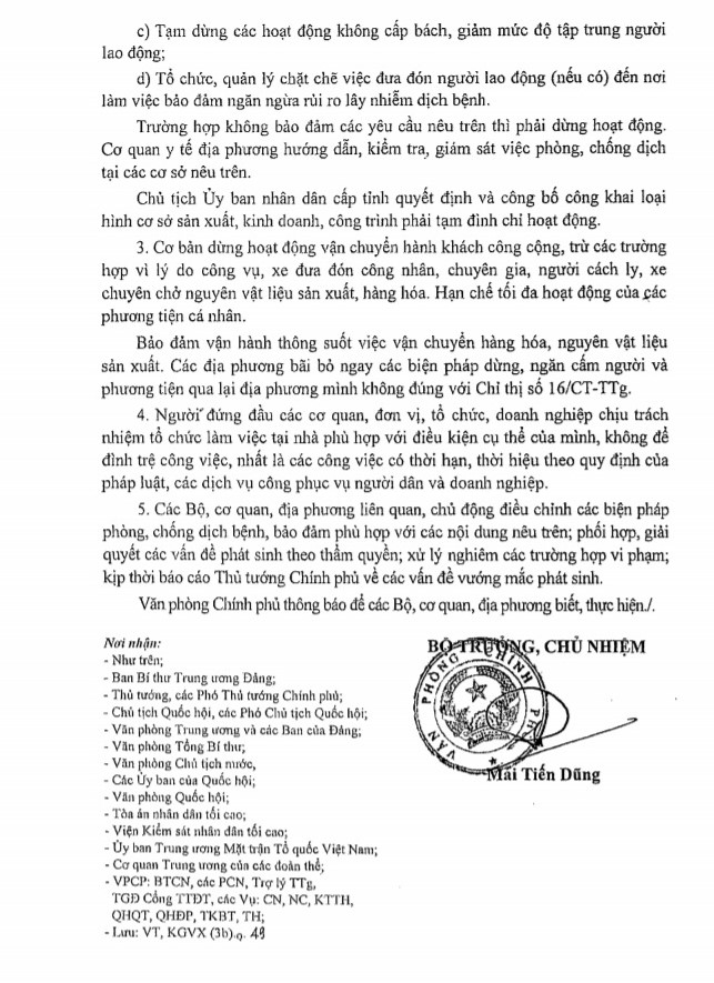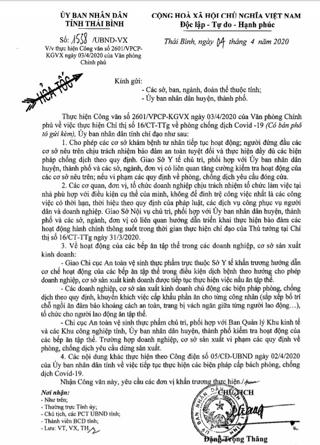 Công văn hỏa tốc số 1538 của UBND tỉnh về việc thực hiện Công văn số 2601/VPCP-KGVX ngày 03/4/2020 của Văn phòng Chính phủ