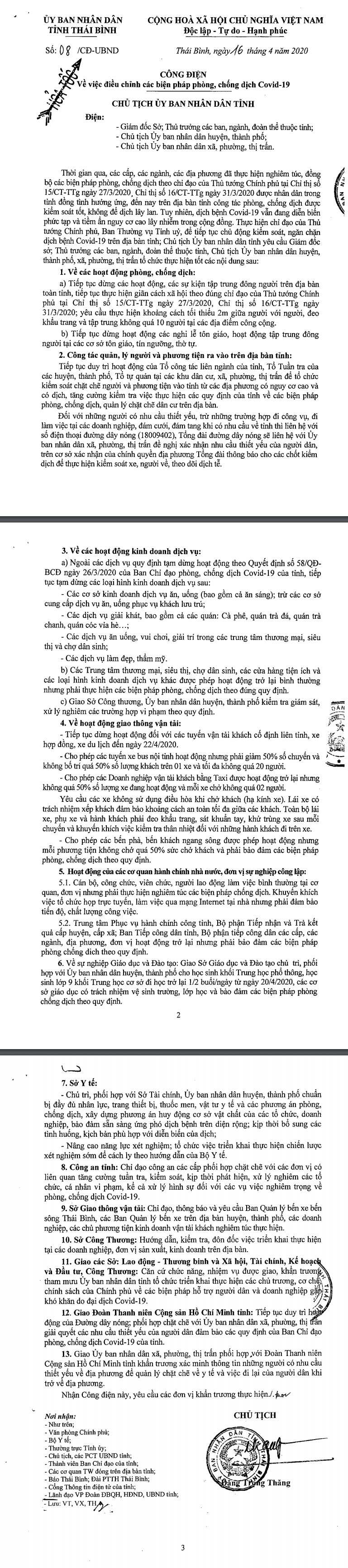 Ngày 16/4/2020, Ủy ban nhân dân tỉnh ban hành Công điện số 08/CĐ-UBND về việc điều chỉnh các biện pháp phòng, chống dịch Covid-19.