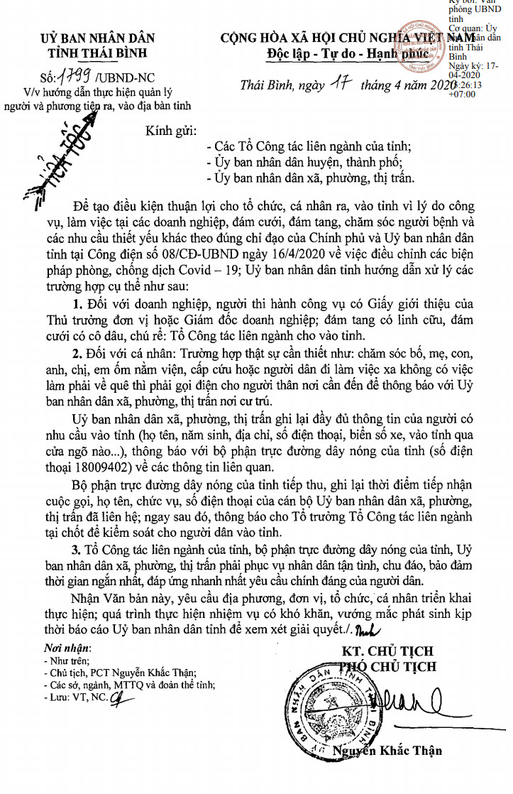 Ngày 17/4/2020, Ủy ban nhân dân tỉnh Thái Bình ban hành Công văn số 1799/UBND-NC về việc hướng dẫn thực hiện quản lý người và phương tiện ra, vào địa bàn tỉnh.