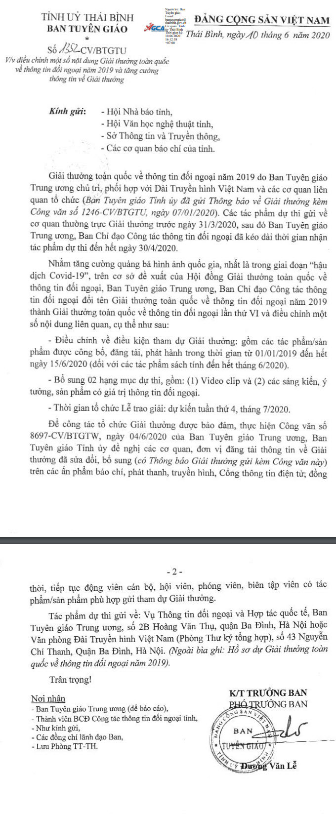 Công văn số 1352-CV/BTGTU về việc điều chỉnh một số nội dung Giải thưởng toàn quốc về thông tin đối ngoại năm 2019 và tăng cường thông tin về giải thưởng