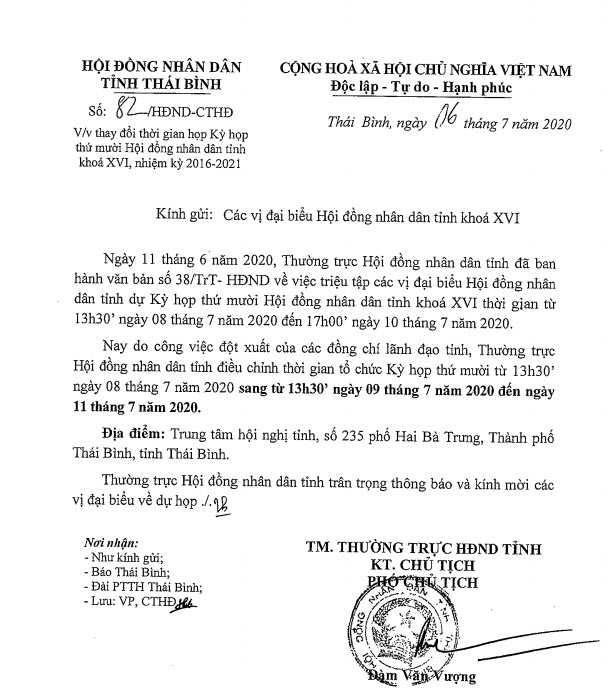 Thay đổi thời gian họp Kỳ họp thứ mười Hội đồng nhân dân tỉnh khóa XVI, nhiệm kỳ 2016 - 2021
