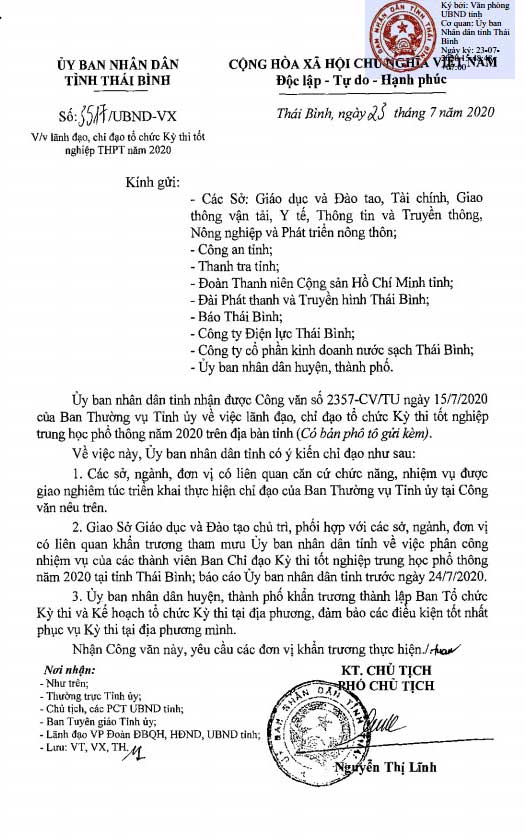 Ngày 23/7, UBND tỉnh có Công văn số 3517/UBND-VX về việc lãnh đạo, chỉ đạo tổ chức Kỳ thi tốt nghiệp THPT năm 2020. Nội dung như sau