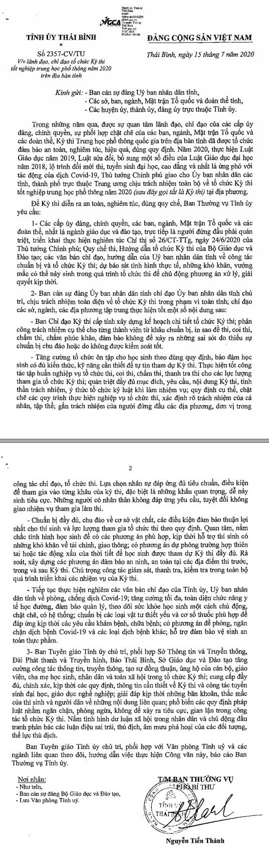 Nội dung Công văn số 2357-CV/TU ngày 15/7/2020 của Ban Thường vụ Tỉnh uỷ về việc lãnh đạo, chỉ đạo tổ chức Kỳ thi tốt nghiệp THPT năm 2020 trên địa bàn tỉnh.