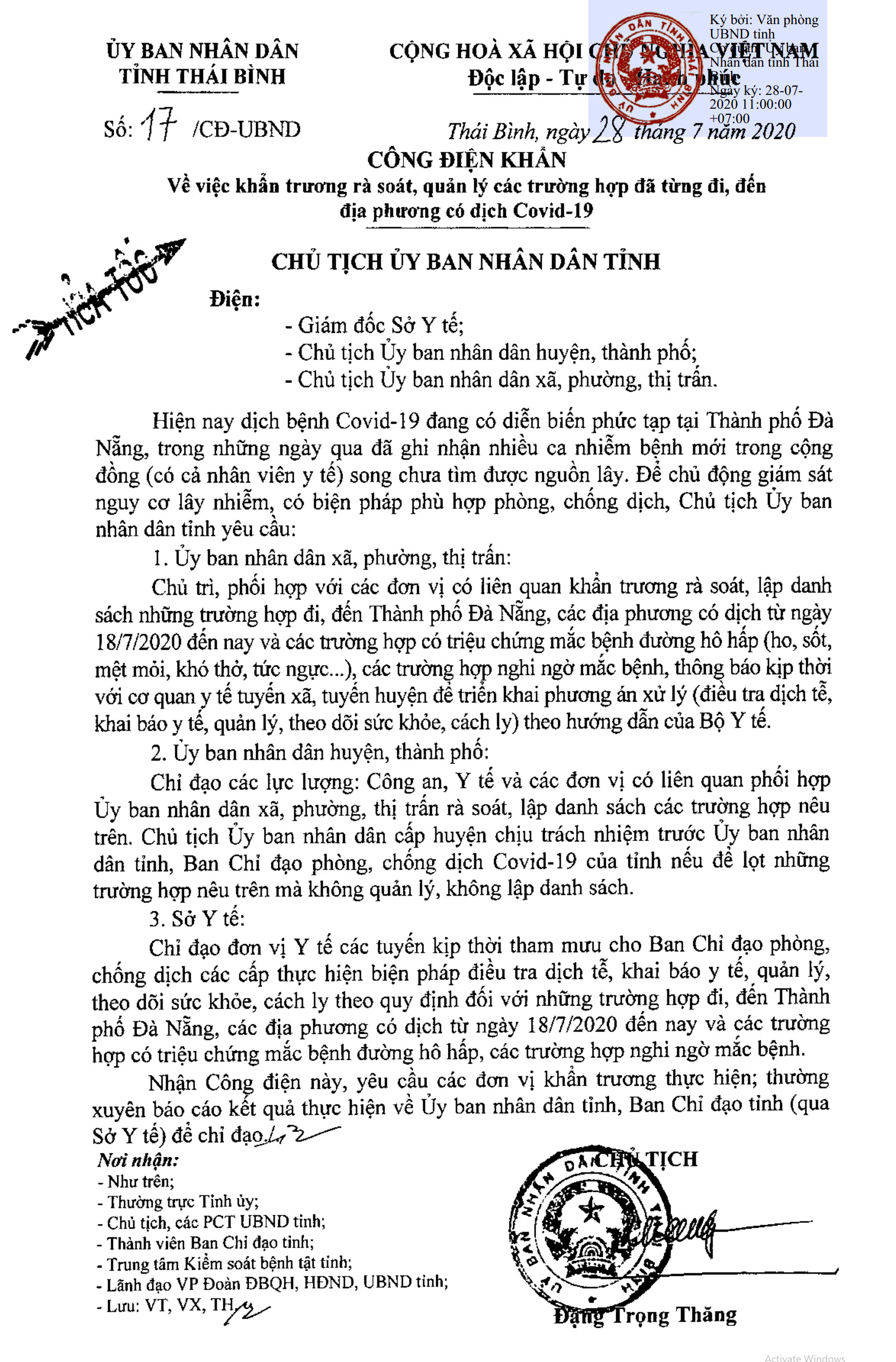 Ngày 28/7/2020, Ủy ban nhân dân tỉnh Thái Bình ban hành Công điện khẩn số 17/CĐ-UBND về việc khẩn trương rà soát, quản lý các trường hợp đã từng đi, đến địa phương có dịch Covid-19.