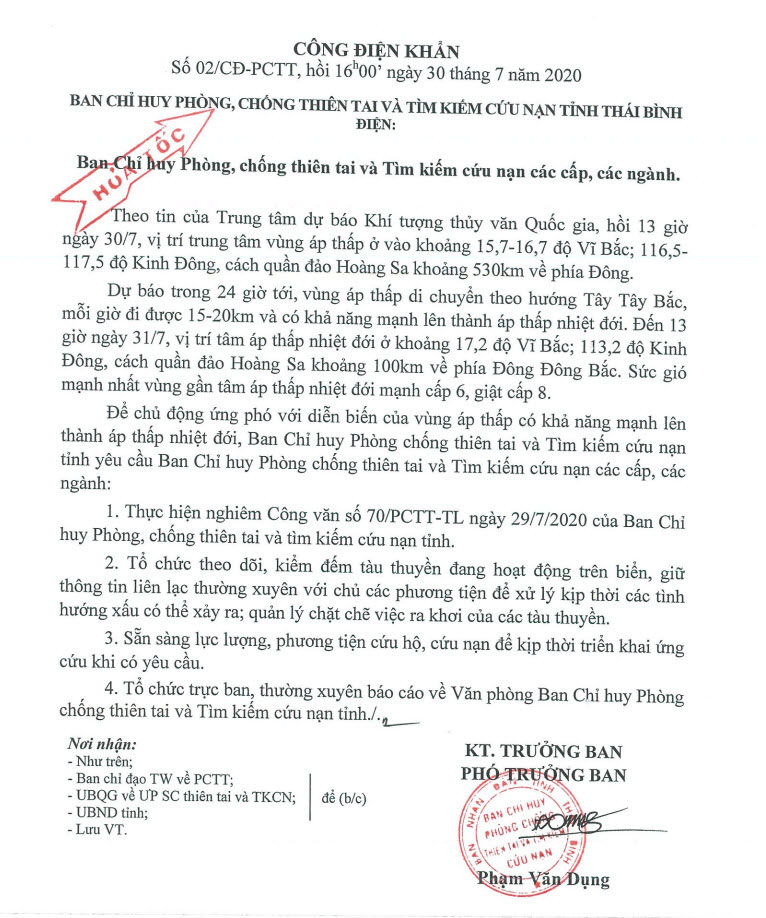 Hồi 16h00' ngày 30/7, Ban Chỉ huy Phòng, chống thiên tai và Tìm kiếm cứu nạn tỉnh ra Công điện số 02/CĐ-PCTT gửi Ban Chỉ huy Phòng, chống thiên tai và Tìm kiếm cứu nạn các cấp, các ngành.