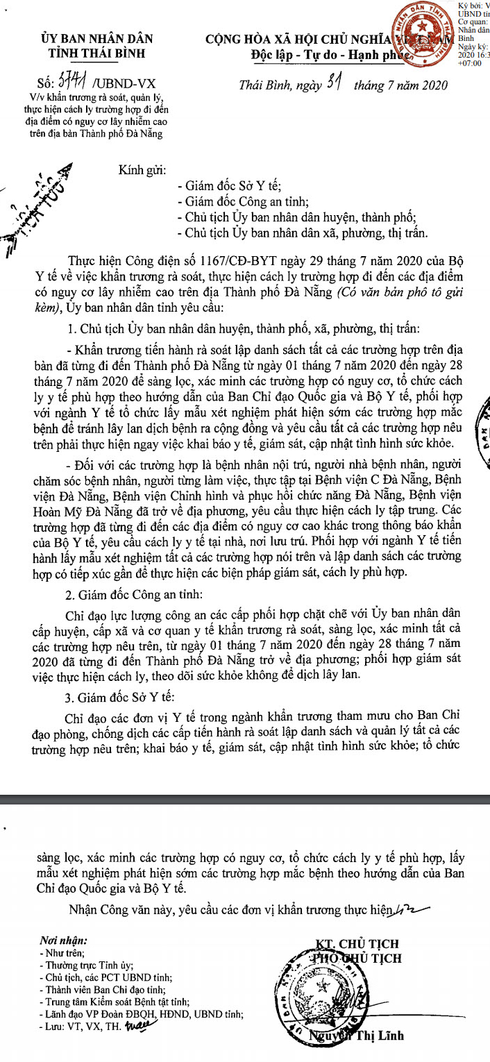 Ngày 31/7/2020, Ủy ban nhân dân tỉnh Thái Bình ban hành Công văn số 3741/UBND-VX về việc khẩn trương rà soát, quản lý, thực hiện cách ly trường hợp đi đến địa điểm có nguy cơ lây nhiễm cao trên địa bàn Thành phố Đà Nẵng.
