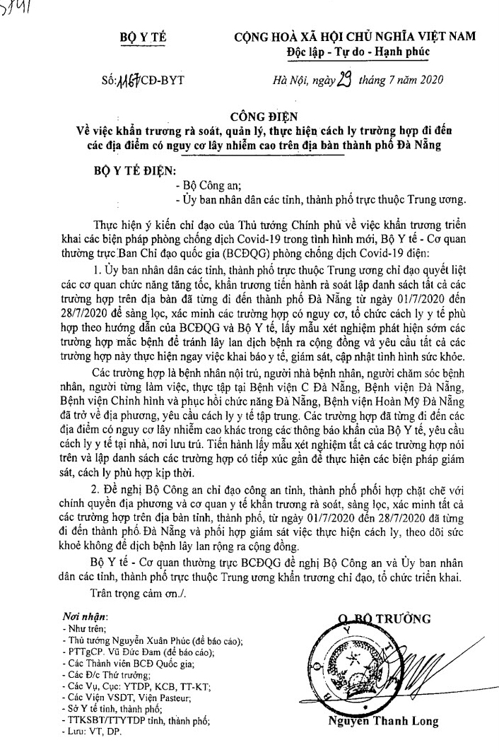 Công văn số 3741/UBND-VX về việc khẩn trương rà soát, quản lý, thực hiện cách ly trường hợp đi đến địa điểm có nguy cơ lây nhiễm cao trên địa bàn Thành phố Đà Nẵng