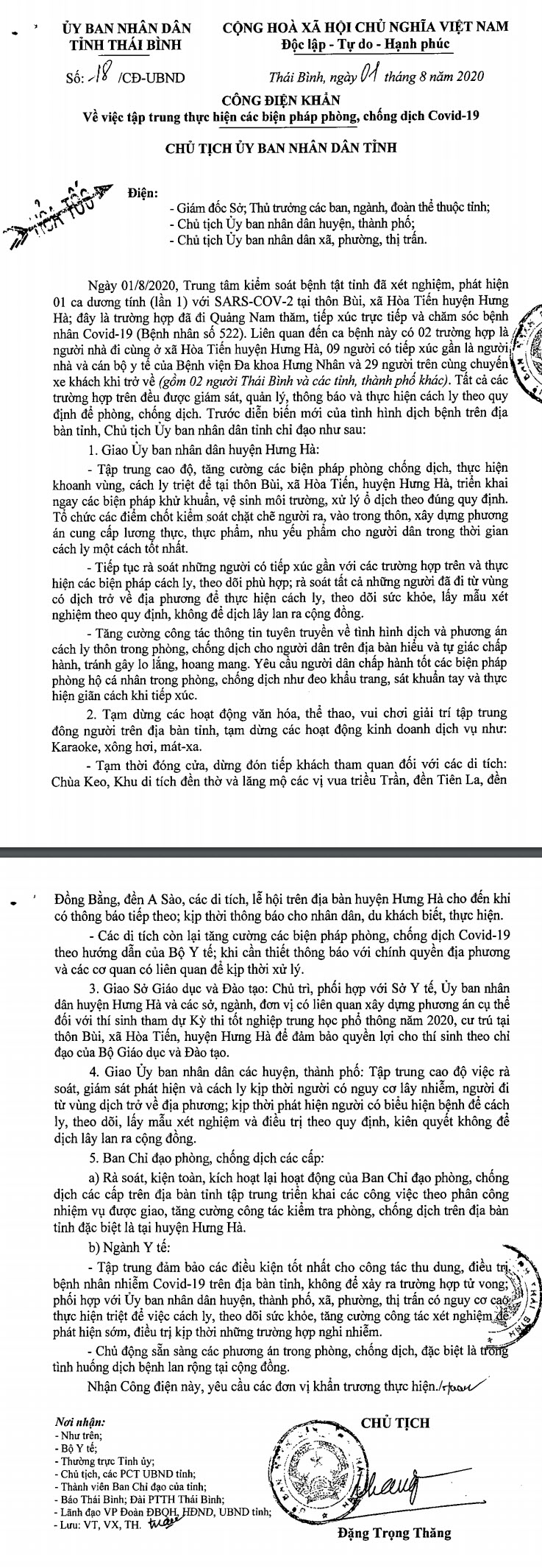 Ngày 01/8/2020, Ủy ban nhân dân tỉnh Thái Bình ban hành Công điện khẩn số 18/CĐ-UBND về việc tập trung thực hiện các biện pháp phòng, chống dịch Covid-19.