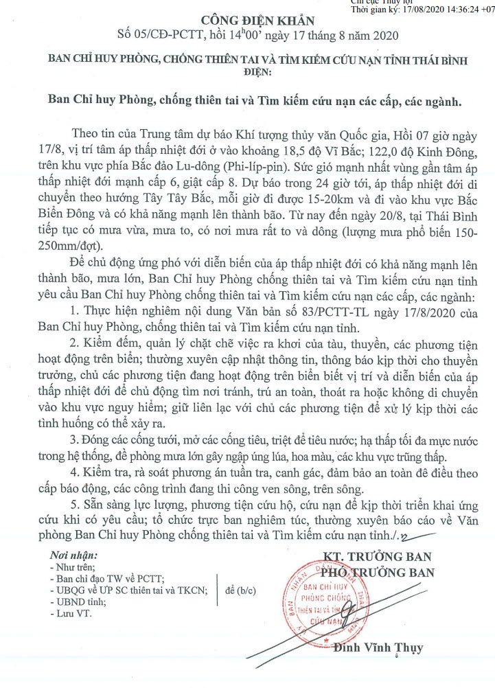Hồi 14h ngày 17/8, Trưởng ban Chỉ huy Phòng, chống thiên tai và Tìm kiếm cứu nạn tỉnh ra Công điện số 05/CĐ-PCTT gửi Ban Chỉ huy Phòng, chống thiên tai và Tìm kiếm cứu nạn các cấp, các ngành.