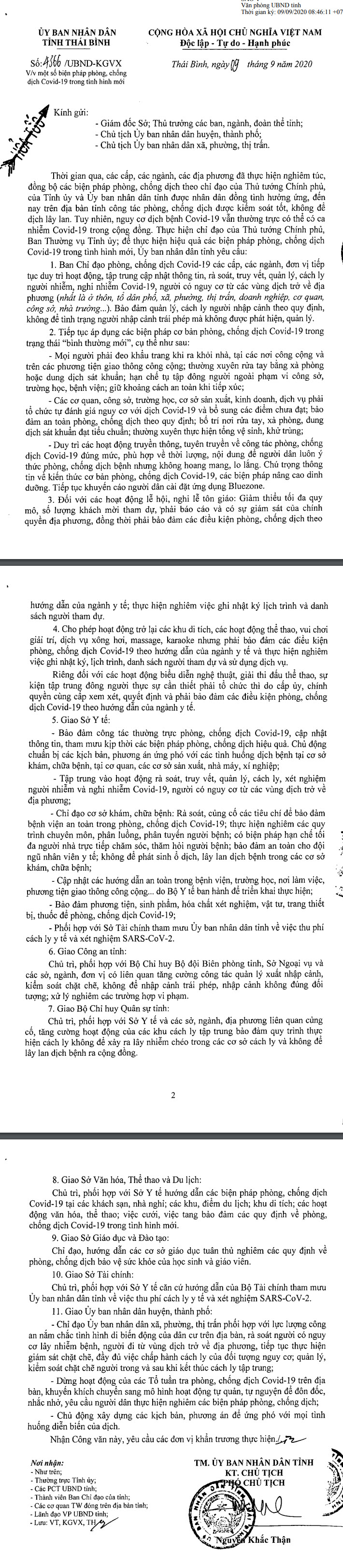 Ngày 9/9/2020, Ủy ban nhân dân tỉnh Thái Bình ban hành Công văn số 4366/UBND-KGVX về một số biện pháp phòng, chống dịch Covid-19 trong tình hình mới.