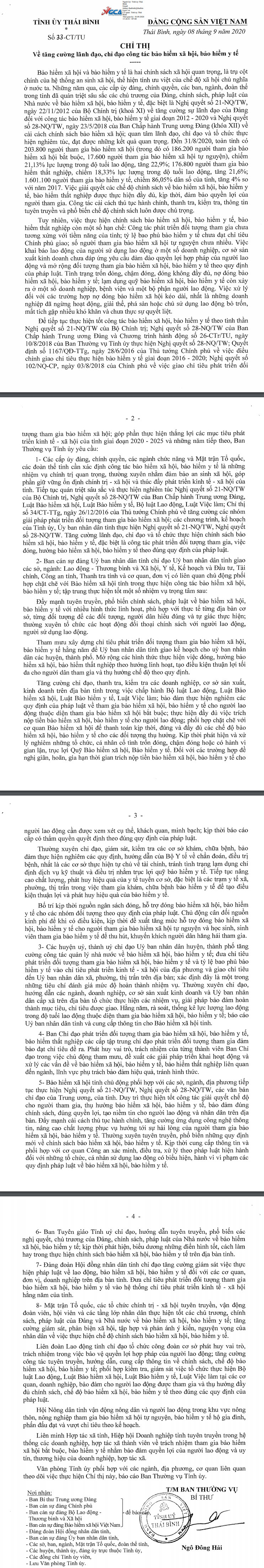 Ngày 8/9/2020, Tỉnh ủy Thái Bình ban hành Chỉ thị số 33-CT/TU về tăng cường lãnh đạo, chỉ đạo công tác bảo hiểm xã hội, bảo hiểm y tế.