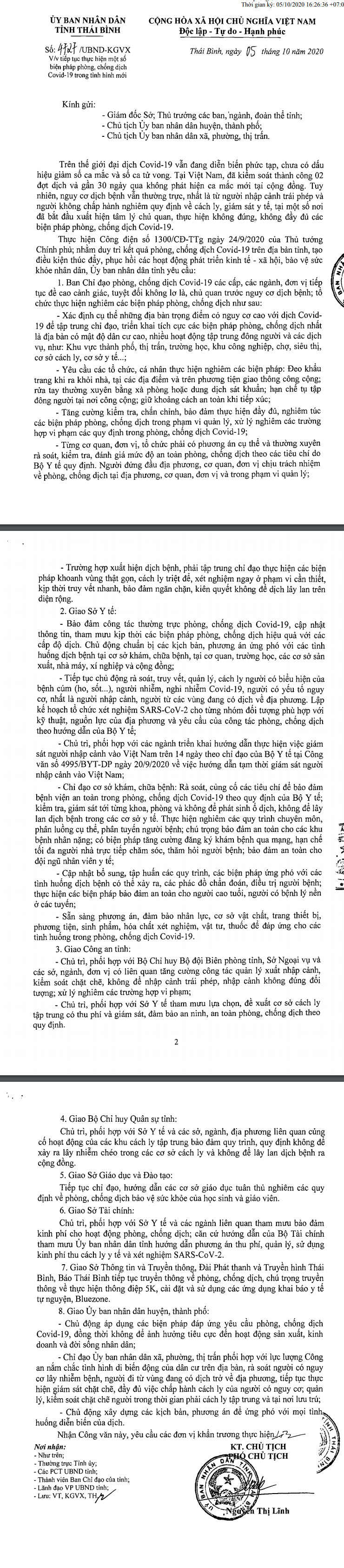 Ngày 5/10/2020, Ủy ban nhân dân tỉnh Thái Bình ban hành Công văn số 4727/UBND-KGVX về việc tiếp tục thực hiện một số biện pháp phòng, chống dịch Covid-19 trong tình hình mới.
