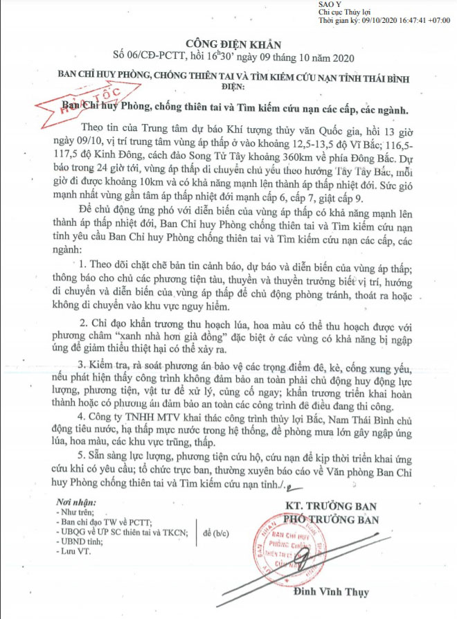 Ngày 09/10, Ban Chỉ huy Phòng, chống thiên tai và Tìm kiếm cứu nạn tỉnh Thái Bình có Công điện khẩn số 06/CĐ-PCTT gửi Ban Chỉ huy Phòng chống thiên tai và Tìm kiếm cứu nạn các cấp, các ngành.