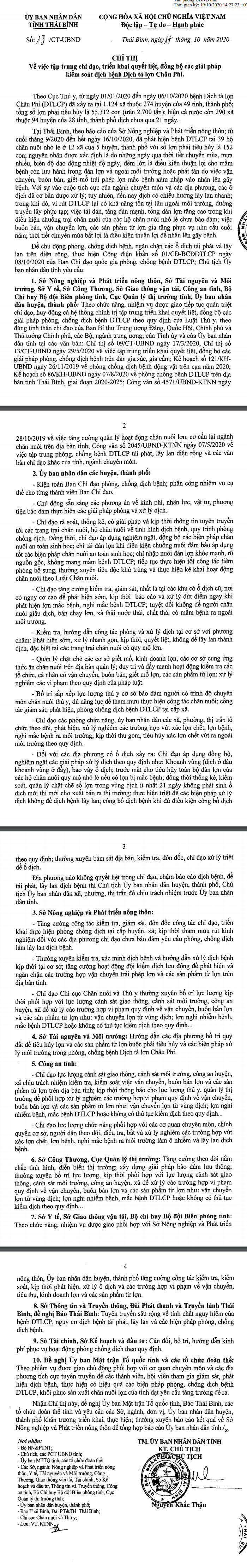 Ngày 17/10/2020, Ủy ban nhân dân tỉnh Thái Bình ban hành Chỉ thị số 19/CT-UBND về việc tập trung chỉ đạo, triển khai quyết liệt, đồng bộ các giải pháp kiểm soát dịch bệnh dịch tả lợn châu Phi.