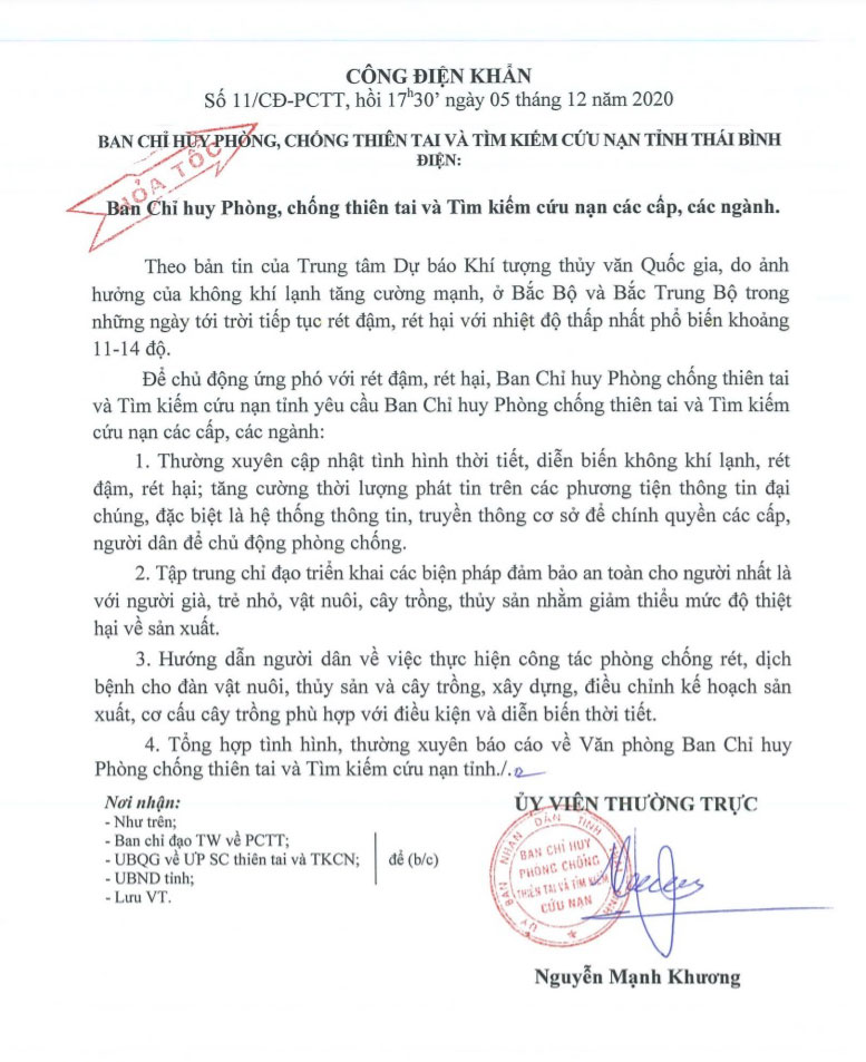 Ngày 5/12, Ban Chỉ huy Phòng, chống thiên tai và Tìm kiếm cứu nạn tỉnh Thái Bình có Công điện khẩn số 11/CĐ-PCTT điện Ban Chỉ huy Phòng, chống thiên tai và Tìm kiếm cứu nạn các cấp, các ngành.