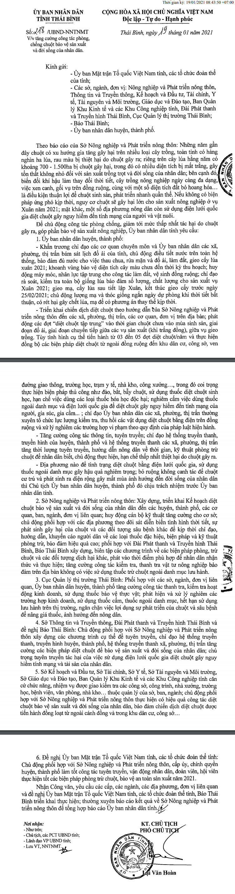 Ngày 19/01/2021, Ủy ban nhân dân tỉnh Thái Bình ban hành Công văn số 218/UBND-NNTNMT về việc tăng cường công tác phòng, chống chuột bảo vệ sản xuất và đời sống nhân dân.