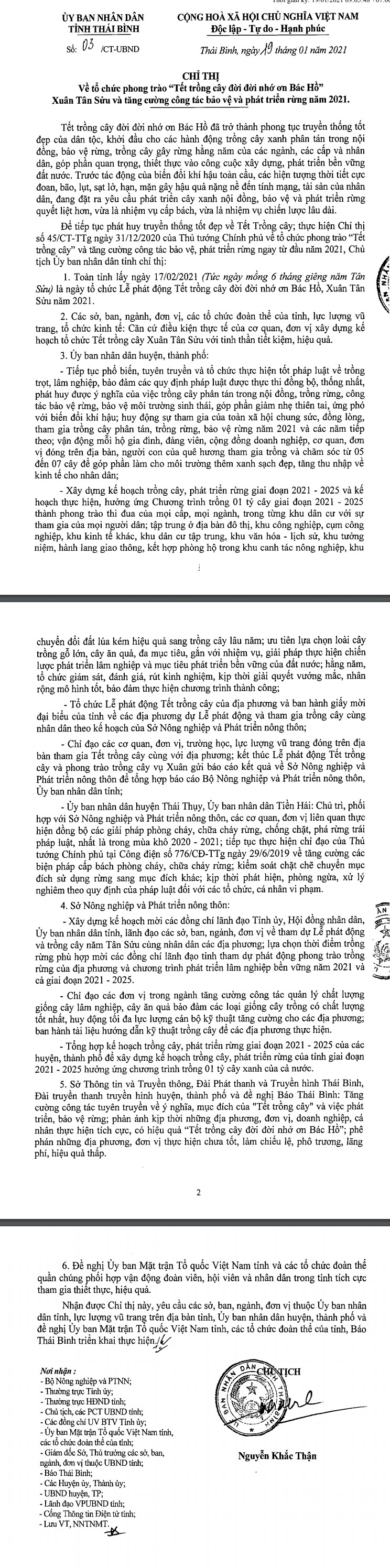 Ngày 19/01/2021, Ủy ban nhân dân tỉnh Thái Bình ban hành Chỉ thị số 03/CT-UBND về tổ chức phong trào "Tết trồng cây đời đời nhớ ơn Bác Hồ" Xuân Tân Sửu và tăng cường công tác bảo vệ và phát triển rừng năm 2021.