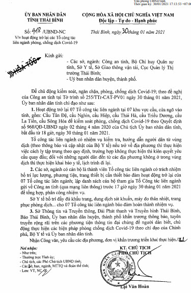 Ngày 30/1/2021, Ủy ban nhân dân tỉnh ban hành Công văn số 418/UBND-NC về việc hoạt động trở lại các Tổ công tác liên ngành phòng, chống dịch Covid-19.