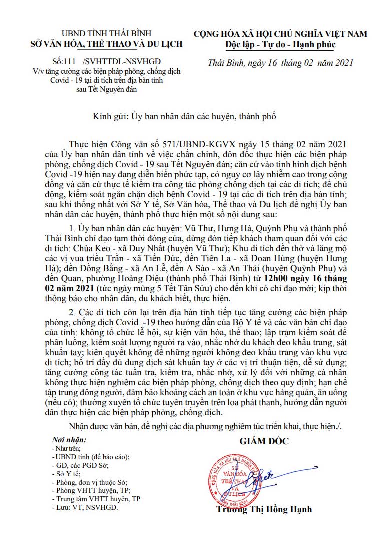 Ngày 16/2, Sở Văn hóa, Thể thao và Du lịch tỉnh Thái Bình có Công văn số 111/SVHTTDL-NSVHGĐ về việc tăng cường các biện pháp phòng, chống dịch Covid - 19 tại di tích trên địa bàn tỉnh sau tết Nguyên đán.