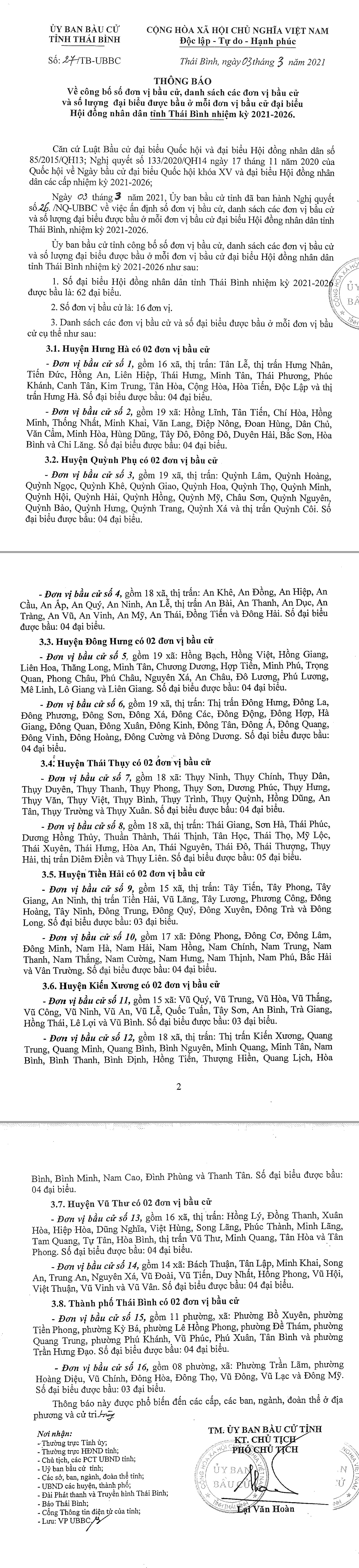 Công bố số đơn vị bầu cử, danh sách các đơn vị bầu cử và số lượng đại biểu được bầu ở mỗi đơn vị bầu cử đại biểu Hội đồng nhân dân tỉnh Thái Bình nhiệm kỳ 2021-2026